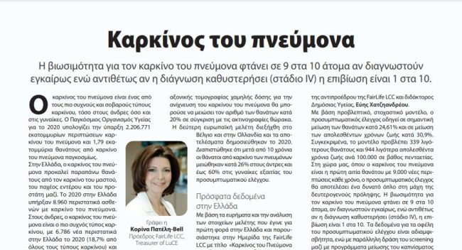 Η FairLife L.C.C. στο έντυπο ”Περί Υγείας” για τον προσυμπτωματικό έλεγχο του Καρκίνου του Πνεύμονα