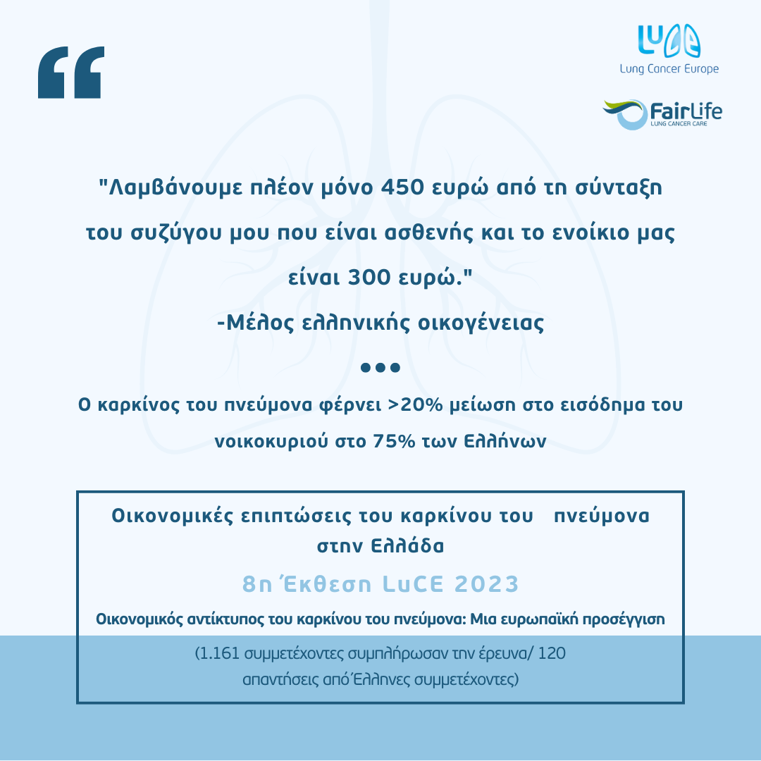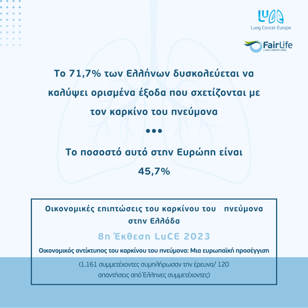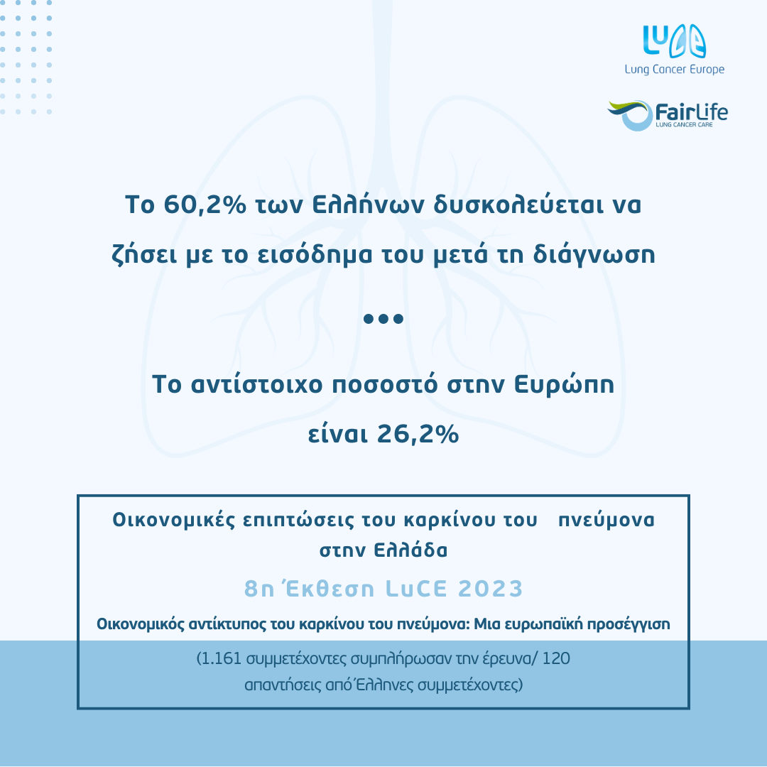 -Το 61,4% των συμμετεχόντων από την Ελλάδα χρειάζεται πάνω από το 20% του εισοδήματος του νοικοκυριού του για να πληρώσει τις δαπάνες που σχετίζονται με τον καρκίνο του πνεύμονα έναντι του 31,7% του μέσου όρου σε Ευρωπαϊκό επίπεδο.