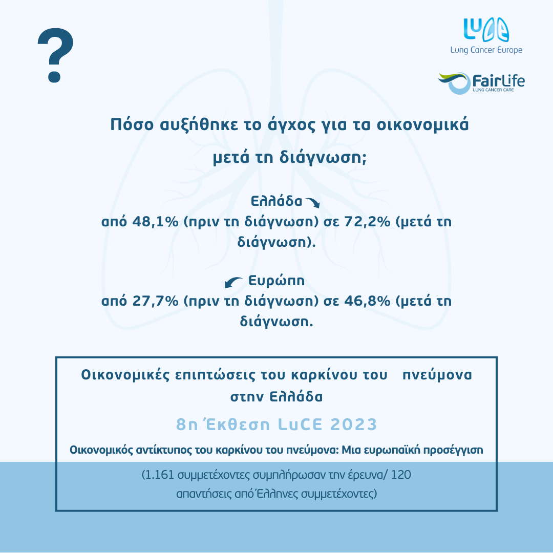 – Η έρευνα υποδηλώνει ότι ο καρκίνος του πνεύμονα αποτελεί παράγοντα κινδύνου πρόκλησης οικονομικής δυσχέρειας. Το ποσοστό των Ελλήνων συμμετεχόντων που είχαν άγχος για τα οικονομικά τους αυξήθηκε από 48,1% (πριν τη διάγνωση) σε 72,2% ( μετά τη διάγνωση). Τα αντίστοιχα ποσοστά στον Ευρωπαϊκό μέσο όρο αυξήθηκαν από 27,7% σε 46,8%.