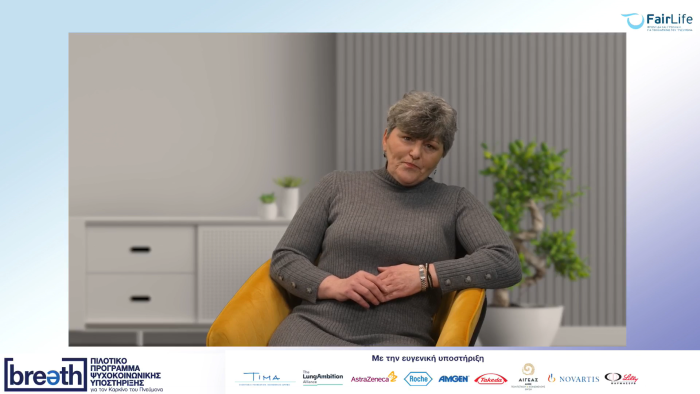 «Οι λέξεις “Κουράγιο”, “Δύναμη” δεν με ανακουφίζουν πια. Εγώ θέλω να βγαίνουμε και να τα λέμε όπως πριν. Χρειάζομαι άλλα πράγματα.Έπρεπε λοιπόν να πάρω κάποιες δυνάμεις, να καταλάβω τα όρια μου. Απευθύνθηκα στο Πρόγραμμα Ψυχοκοινωνικής Υποστήριξης BREATH της FairLife L.C.C. και μέσα από τις συνεδρίες πήρα συμβουλές, απαντήσεις, ξεδιάλυνα σκέψεις και προβληματισμούς. Με δυο λόγια, πήρα δύναμη !» επισήμανε ο κ. Απόστολος Κυριάκης, φροντιστής.
