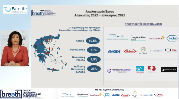Kατά την έναρξη της ενημερωτικής διαδικτυακής εκδήλωσης η κυρία Κορίνα Πατέλη Βell, πρόεδρος της FairLife L.C.C., έκανε μια σύντομη παρουσίαση του προγράμματος BREATH, τονίζοντας, μεταξύ άλλων, ότι « Η FairLife L.C.C. ανέλαβε την πρωτοβουλία να σχεδιάσει και να υλοποιήσει το πρόγραμμα μετά από 2 χρόνια ενεργούς δράσης και επικοινωνίας με ασθενείς και φροντιστές και λαμβάνοντας υπόψη τα αποτελέσματα μελετών του Global Lung Cancer Coalition και του Ευρωπαϊκού Φορέα για τον Καρκίνο του Πνεύμονα (LuCE) τα οποία αναδεικνύουν ότι αποτελεί επιτακτική ανάγκη η ψυχολογική υποστήριξη όσων βιώνουν την νόσο του Καρκίνου του Πνεύμονα. Απόδειξη αποτελεί το γεγονός ότι δεχθήκαμε συνολικά περί τις 1.450 κλήσεις στον ενάμιση χρόνο λειτουργίας της. Στην περίοδο λειτουργίας του προγράμματος από τον Αύγουστο του 2022 μέχρι και τον Ιανουάριο 2023, η γραμμή ενημέρωσης 11157 έλαβε περί τις 80 κλήσεις αναφορικά με την ψυχολογική υποστήριξη και συγκέντρωσε 198 ηλεκτρονικά αιτήματα. Οι συμμετοχές στο πρόγραμμα διαμοιράζονται σε ολόκληρη την χώρα, με τις μισές να προέρχονται από την Αττική και οι υπόλοιπες από την Θεσσαλονίκη και λοιπή ηπειρωτική και νησιωτική χώρα. Πρωταγωνιστές και σημείο αναφοράς του προγράμματος είναι οι εκατοντάδες άνθρωποι, με τους οποίους έχουμε έρθει σε επαφή. Αυτοί είναι η πνοή και η δύναμη μας!».