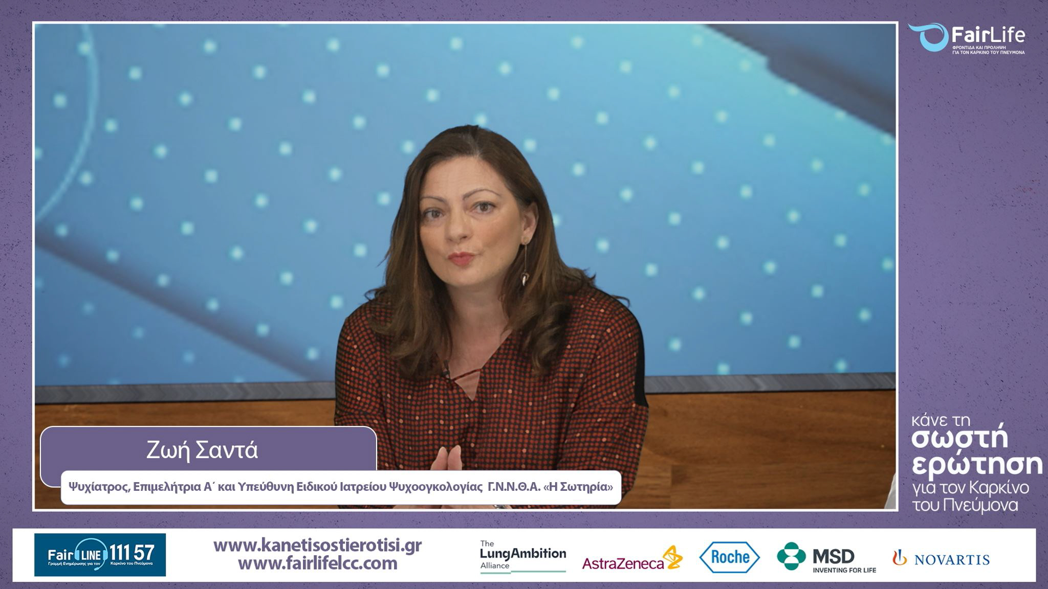 “Ένας στους τρείς ασθενείς με καρκίνο του πνεύμονα θα αναπτύξει αρνητικά συναισθήματα τέτοιου βάθους, ώστε θα οδηγηθεί σε κατάθλιψη και αγχώδεις διαταραχές“ υποστήριξε η κυρία Ζωή Σαντά, Ψυχίατρος, Επιμελήτρια Α΄ και Υπεύθυνη Ειδικού Ιατρείου Ψυχοογκολογίας Γ.Ν.Ν.Θ.Α. «Η Σωτηρία».
