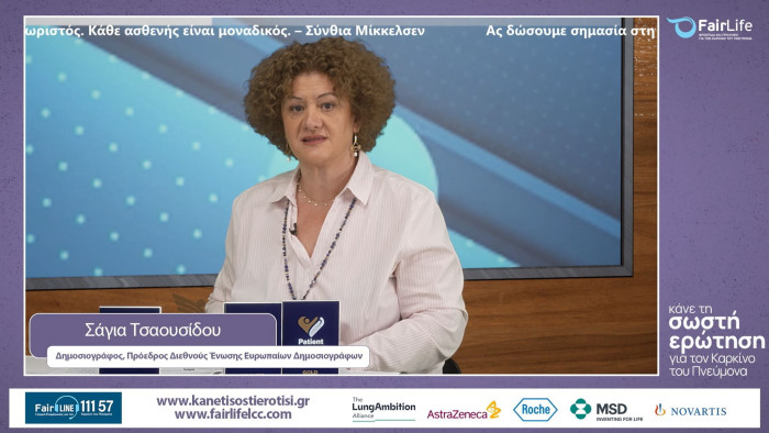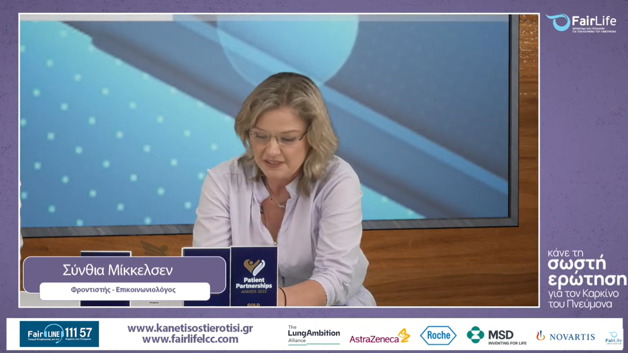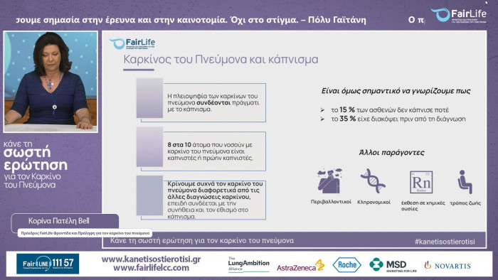 Κατά την έναρξη της ενημερωτικής διαδικτυακής εκδήλωσης, η κυρία Κορίνα Πατέλη Bell, Πρόεδρος της FairLife L.C.C. έκανε μια σύντομη παρουσίαση της καμπάνιας “Κάνε τη σωστή ερώτηση”, μιλώντας για τον ξεχωριστό χαρακτήρα της δράσης και το ηχηρό μήνυμα που στοχεύει να περάσει ενάντια στο στίγμα του καρκίνου του πνεύμονα. Η κυρία Πατέλη- Bell ανέφερε πως χρειάστηκαν πολλοί μήνες ομαδικής δουλειάς για την προσέγγιση ενός τόσο ευαίσθητου θέματος και την παρουσίαση ενός αποτελέσματος που να δικαιώνει πρωτίστως τους ανθρώπους που συμμετείχαν στην καμπάνια και το μήνυμα που θέλησαν να μοιραστούν ασθενείς, φροντιστές και μέλη οικογενειών.“Το στίγμα του καρκίνου του πνεύμονα είναι ένα δύσκολο ζήτημα που δεν είναι απόλυτα κατανοητό από πολλούς, παρά το γεγονός ότι είναι βαθιά ριζωμένο στην κοινωνία μας. Ελάχιστοι γνωρίζουν πως κρίνουμε συχνά τον καρκίνο του πνεύμονα διαφορετικά από τις άλλες διαγνώσεις καρκίνου, επειδή συνδέεται με το κάπνισμα. Αυτό επηρεάζει τα άτομα που βιώνουν την ασθένεια, είτε έχουν ιστορικό καπνίσματος είτε όχι. Η καμπάνια δεν απενοχοποιεί το κάπνισμα. Το μήνυμα είναι πως όλοι αξίζουν ίσες ευκαιρίες, είτε καπνίζουν, είτε κάπνιζαν, είτε δεν έχουν δοκιμάσει ποτέ τσιγάρο.“