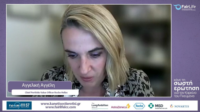 Η κυρία Αγγελική Αγγέλη, Chief Portfolio Value Officer Roche Hellas, αναφέρθηκε στη σημασία στήριξης κάθε προσπάθειας που στοχεύει στην ολιστική αντιμετώπιση του καρκίνου του πνεύμονα. Αναφέρθηκε στην ιδιαιτερότητα της νόσου που επιδέχεται στοχευμένες θεραπείες και στα σημεία που πρέπει να εστιάσει το Εθνικό Σύστημα Υγείας για να δώσει βαρύτητα στο συνολικό ταξίδι του ασθενή, πέρα από την φαρμακευτική αγωγή.