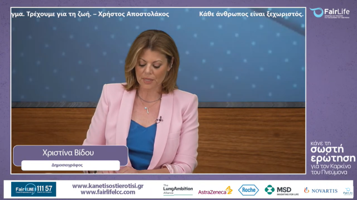 Tην εκδήλωση συντόνισε η δημοσιογράφος κυρία Χριστίνα Βίδου, η οποία μοιράστηκε στιγμές της δικής της οικογενειακής εμπειρίας με τον καρκίνο του πνεύμονα, δίνοντας έναν πιο προσωπικό και ιδιαίτερα ευαισθητοποιημένο τόνο στη συζήτηση.
