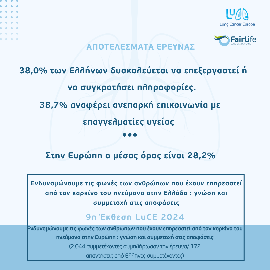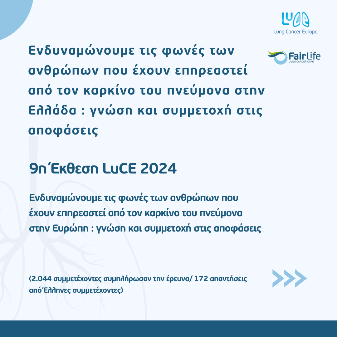 Η FairLife L.C.C. ως ενεργό μέλος του Ευρωπαϊκού Οργανισμού για τον Καρκίνο του Πνεύμονα (LuCE), κοινοποίησε στην Ελλάδα την 9η έρευνα του Ευρωπαϊκού φορέα με τίτλο “Ενδυναμώνουμε τις φωνές των ανθρώπων που έχουν επηρεαστεί από τον καρκίνο του πνεύμονα στην Ευρώπη : γνώση και συμμετοχή στις αποφάσεις“