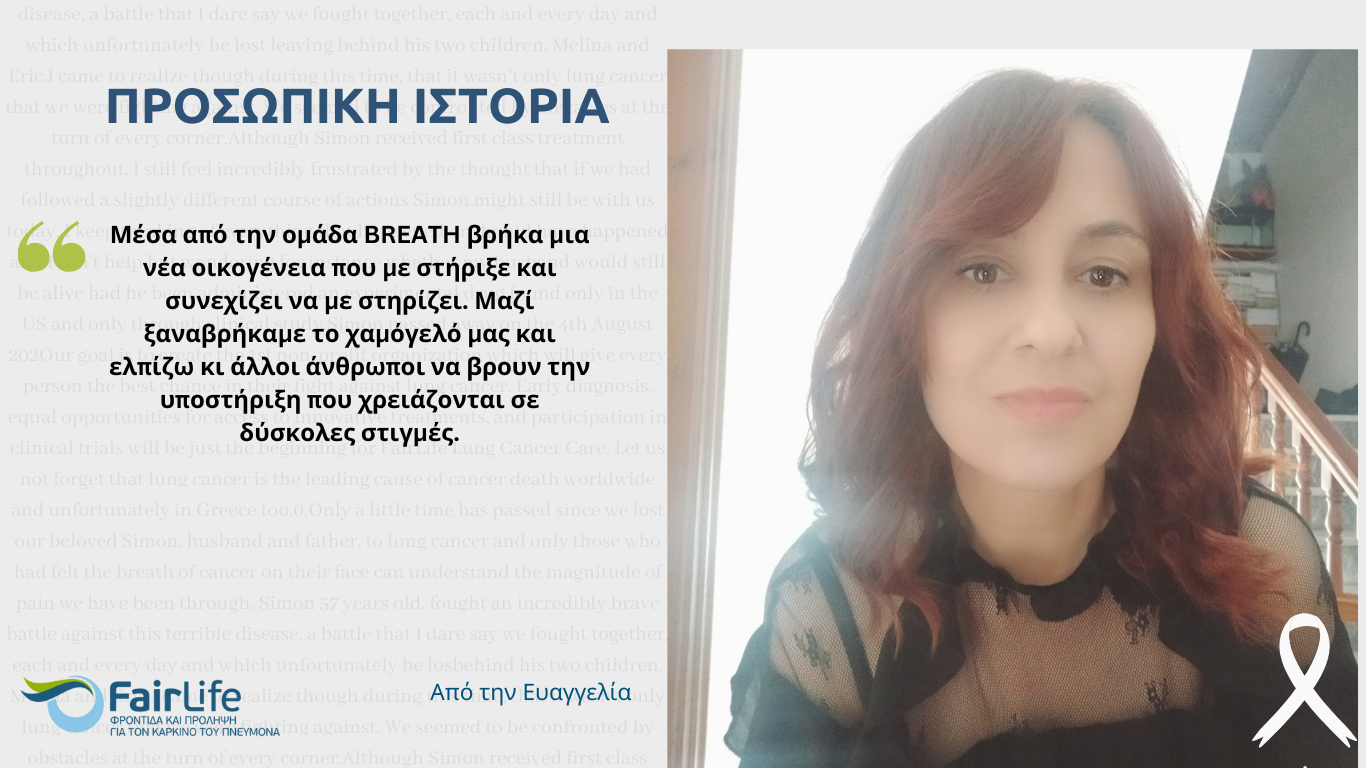 Εάν εσείς ή κάποιο αγαπημένο σας πρόσωπο έχει διαγνωστεί με Καρκίνο του Πνεύμονα, θέλουμε να ακούσουμε την ιστορία σας, θέλουμε να μοιραστείτε τις εμπειρίες σας και να μεταφέρετε το δικό σας μήνυμα στον κόσμο. Η ιστορία σας μπορεί να βοηθήσει χιλιάδες ανθρώπους που βιώνουν τώρα, αυτό που εσείς είχατε βιώσει στο παρελθόν.