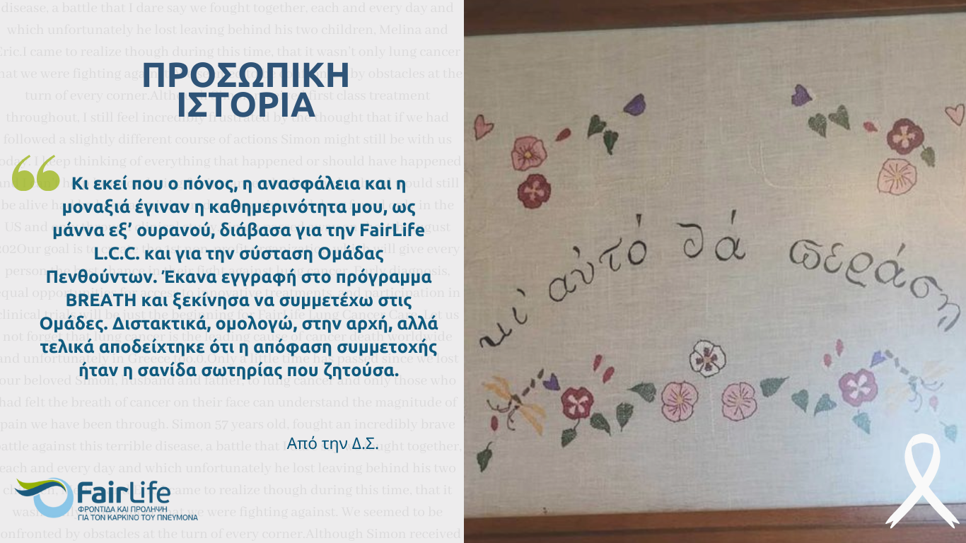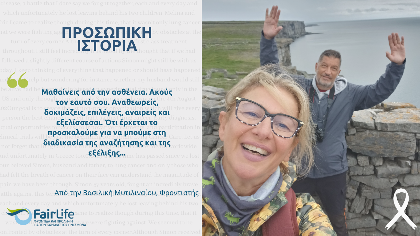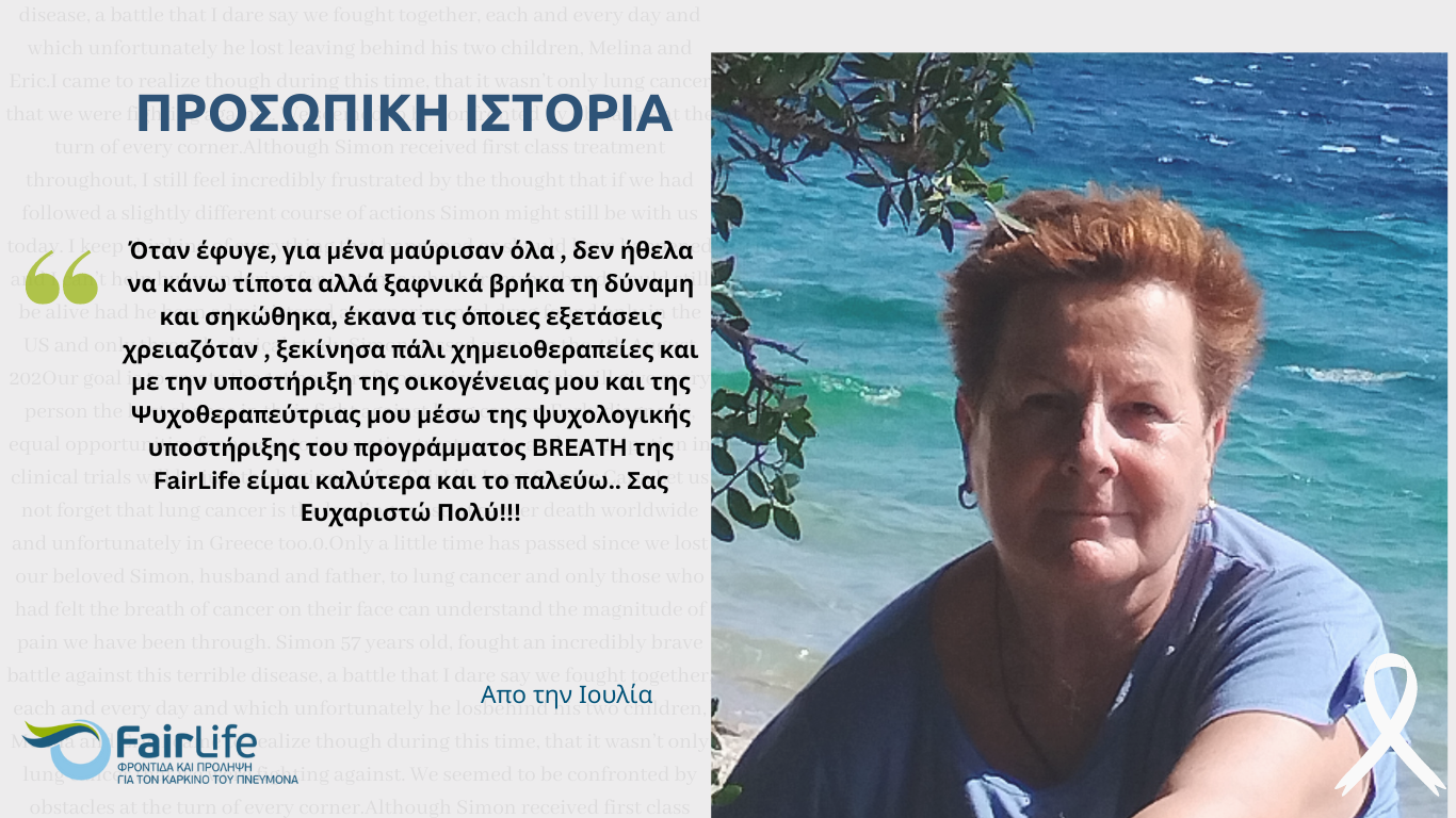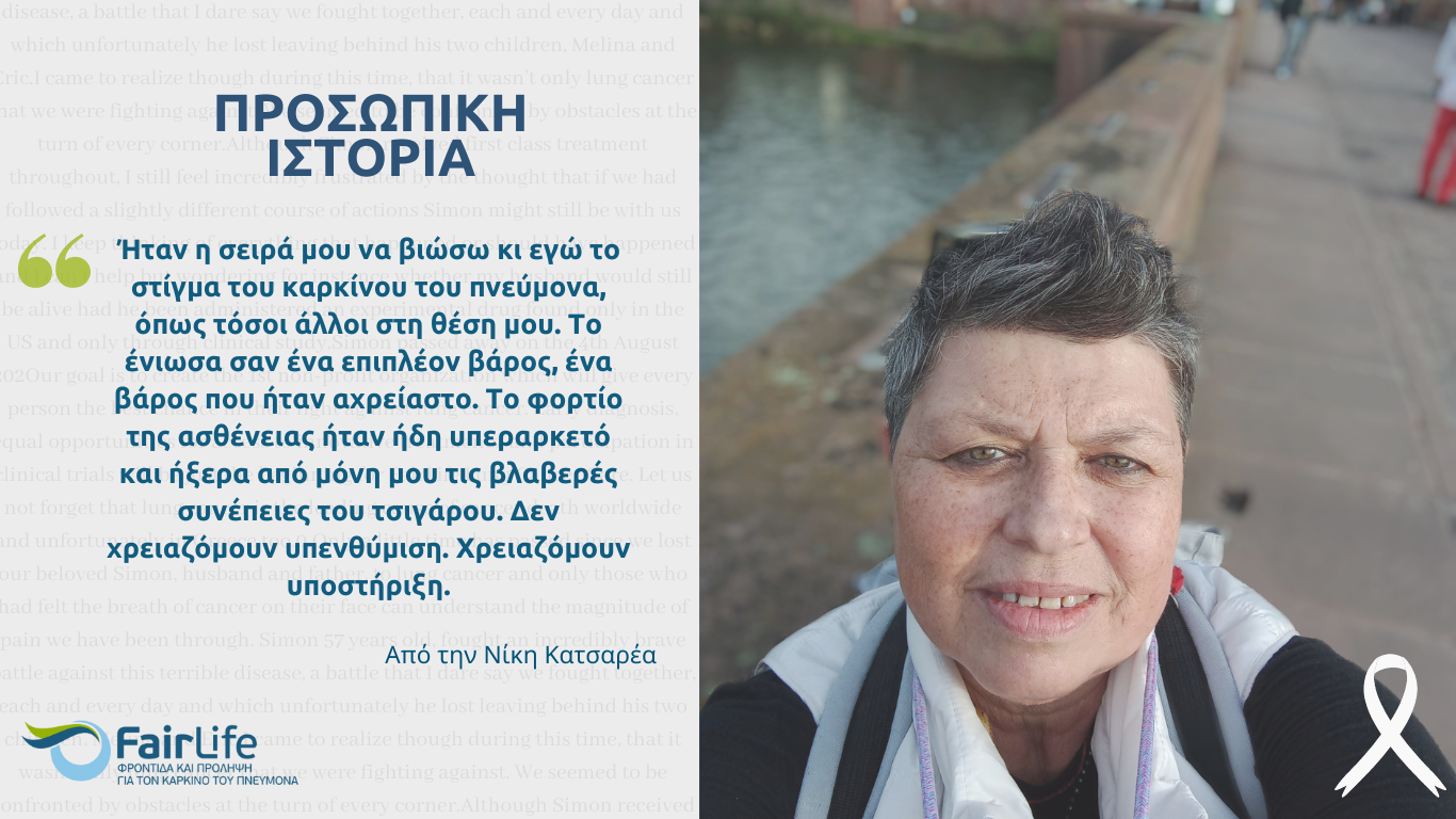 Διαβάστε περισσότεραΑπό την Νίκη Κατσαρέα, Ασθενή, 60 ετών Με κάποια δέκατα και έναν βήχα ξεκίνησε η δική μου διαδρομή με τον καρκίνο του πνεύμονα. Ακολούθησαν…