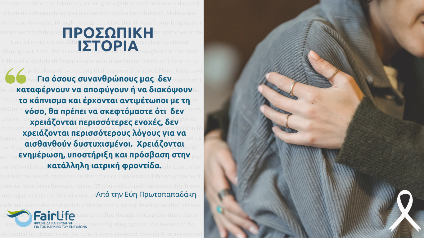 Διαβάστε περισσότεραΑπό την Εύη Πρωτοπαπαδάκη, Μέλος Οικογένειας Ονομάζομαι Πρωτοπαπαδάκη Εύη, είμαι μοριακός βιολόγος και πριν 12 χρόνια έχασα τον πατέρα μου από καρκίνο του πνεύμονα. Ο…