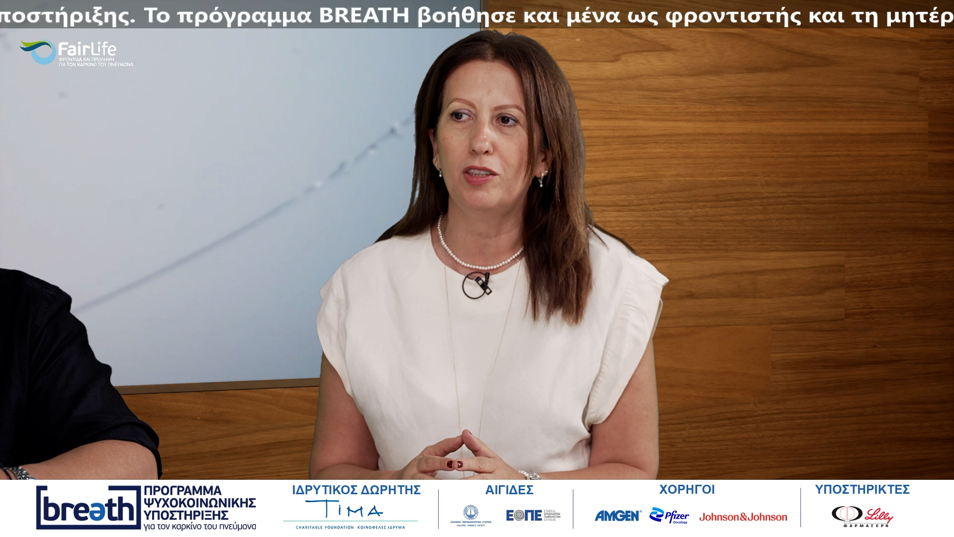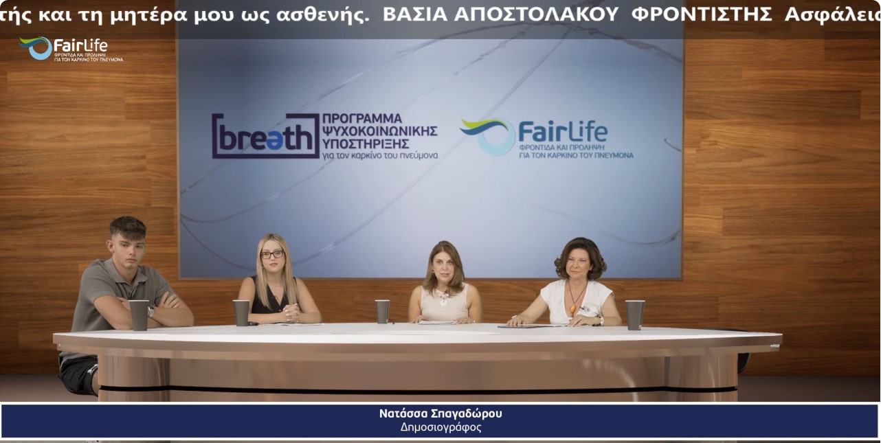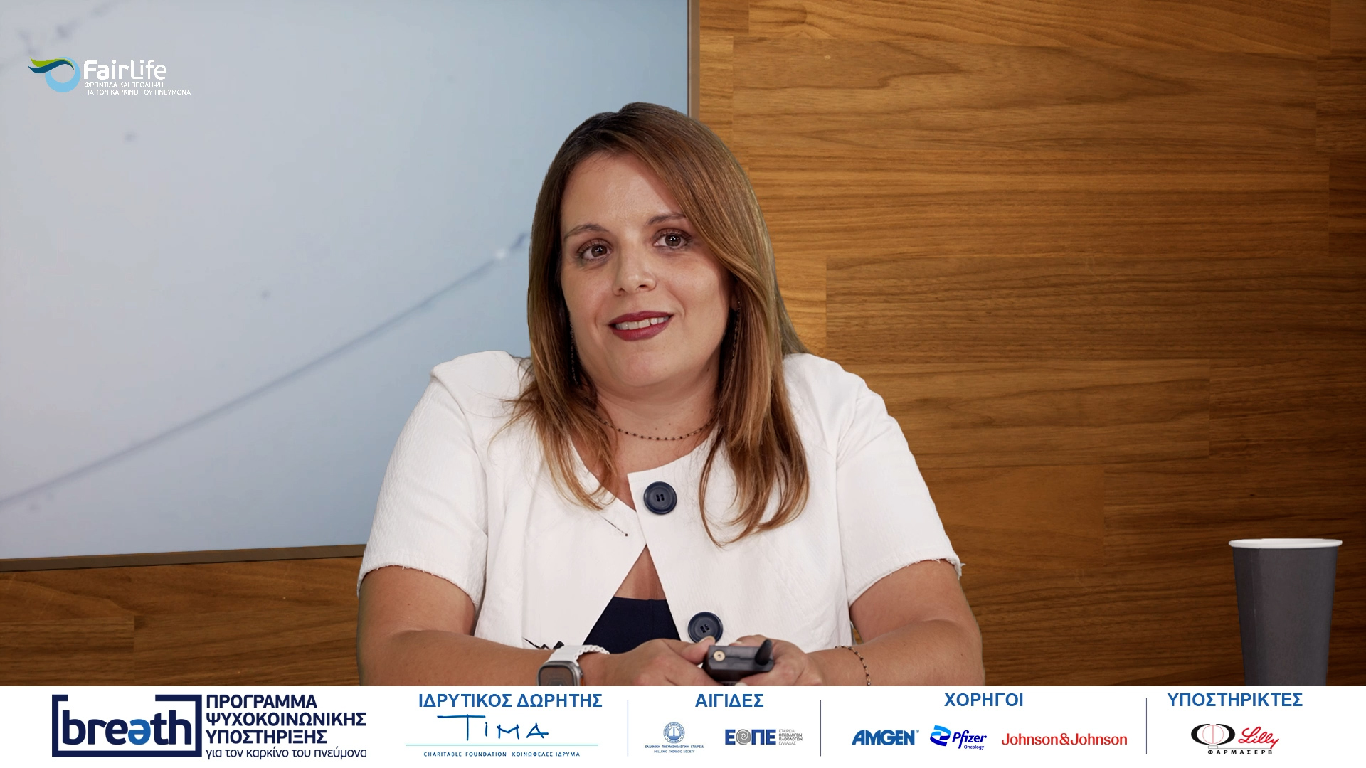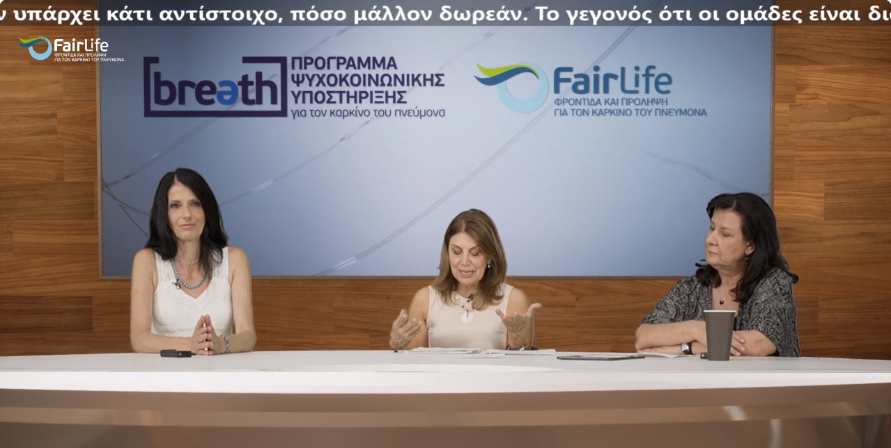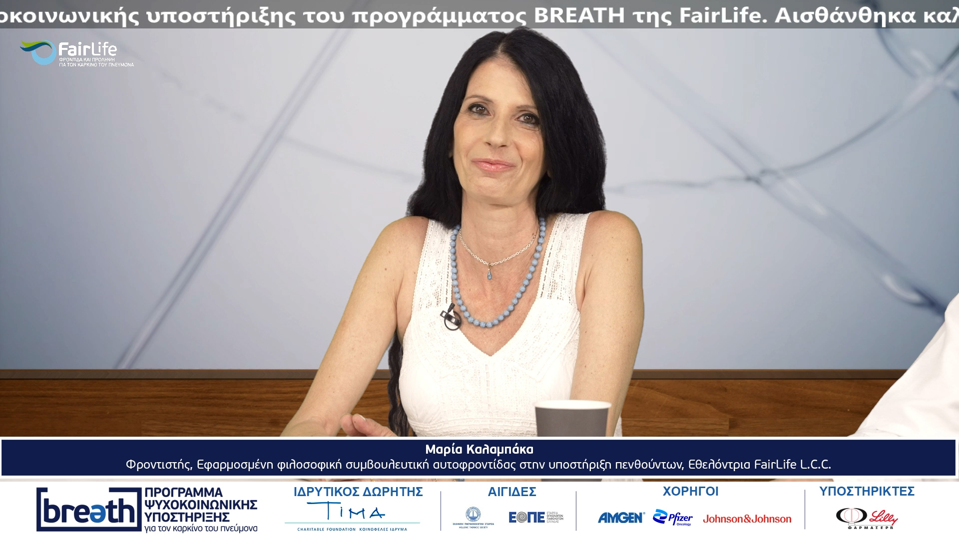 “Cancer does not only affect the body, it mainly affects the soul”, emphasized Ms. Varvara Laliotou, Lung Cancer Patient, who referred to the decisive contribution of the BREATH program in her own journey as a lung cancer patient. She spoke about the great gap that FairLife L.C.C. fills, a gap that should concern state services, and about the individual psychological support, which helped her express emotions without fear or guilt. Ms. Laliotou referred to the professionalism of the people of the BREATH Program and described her experience as valuable, speaking about the strength she found in small, but essential changes, such as seeing her life with meaning again, even in simple things,