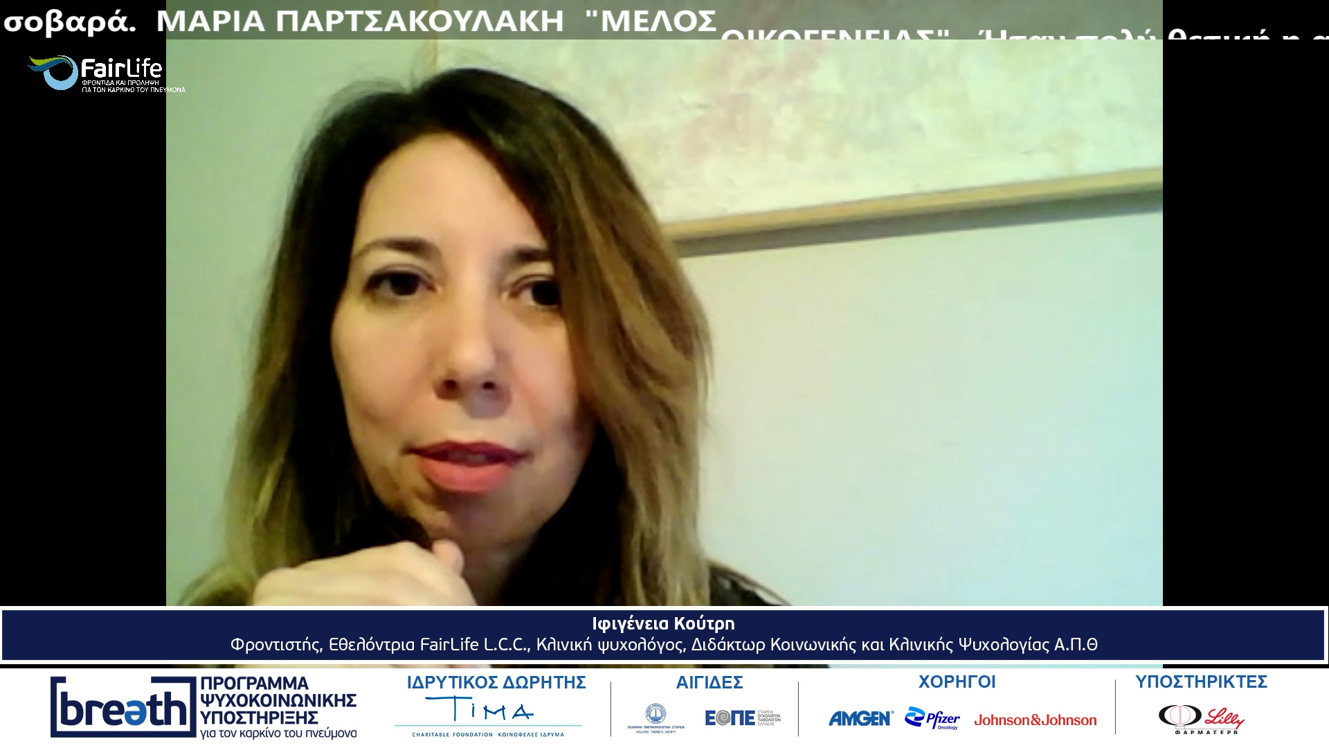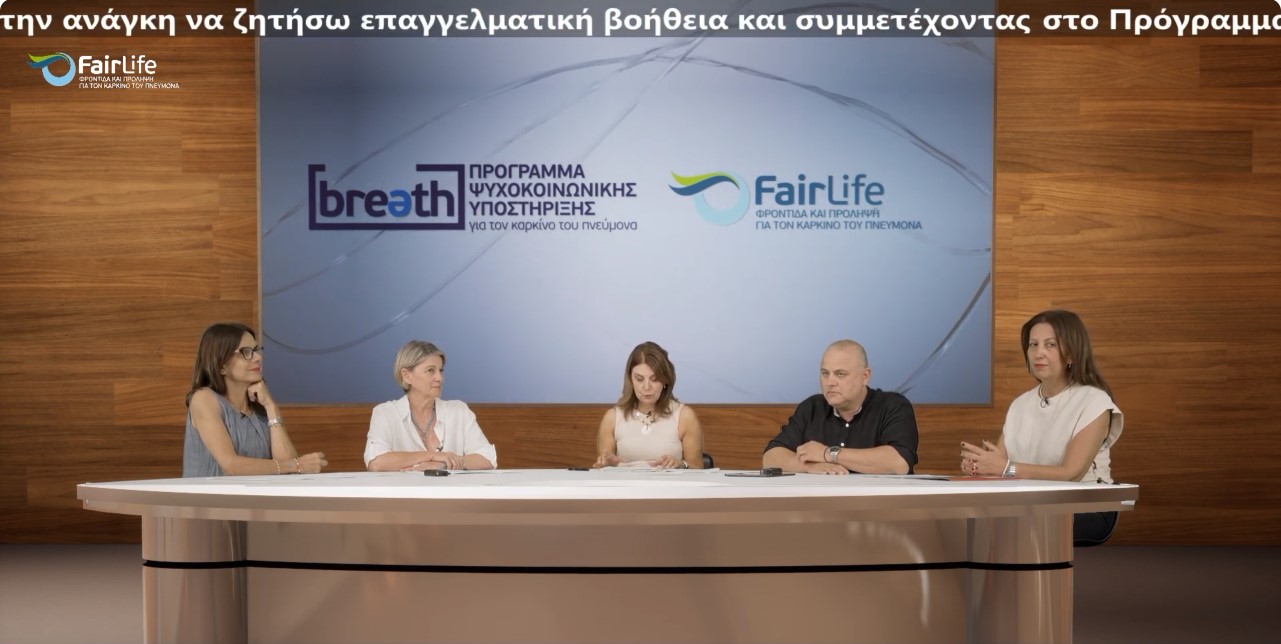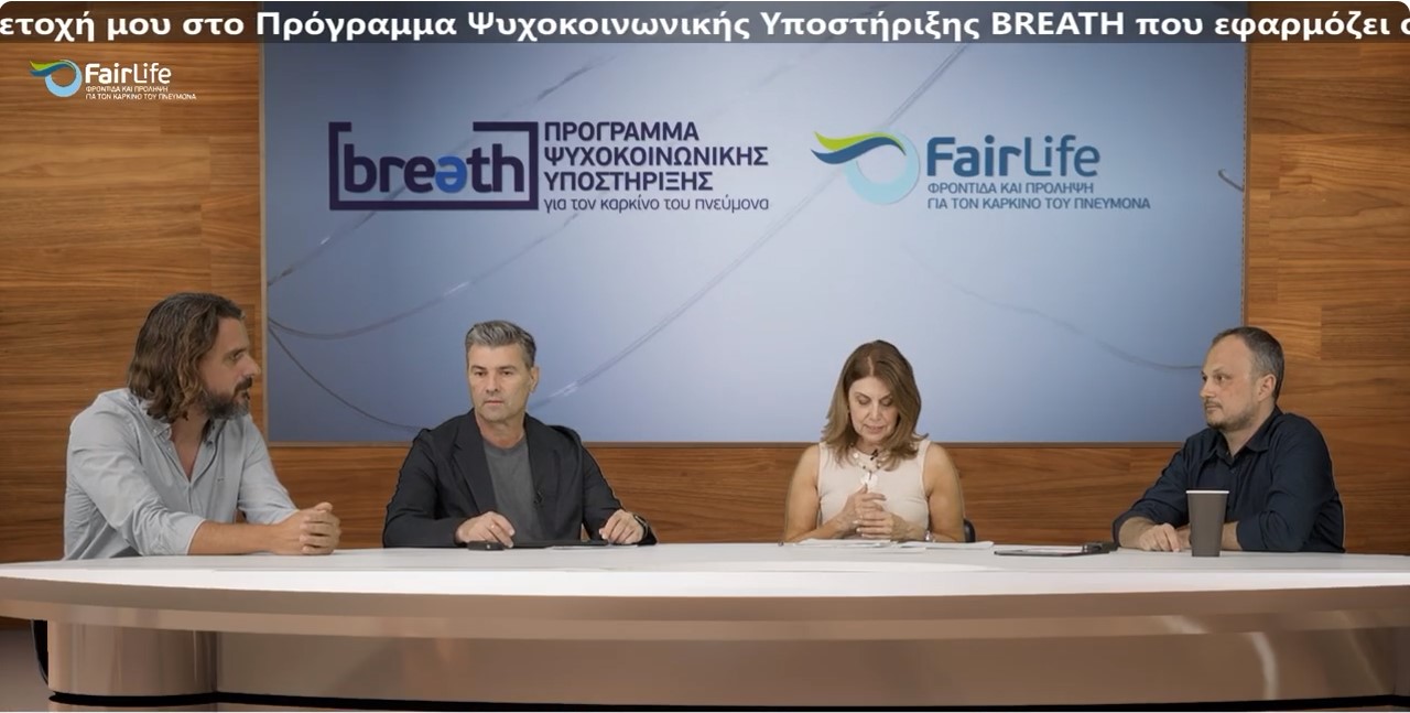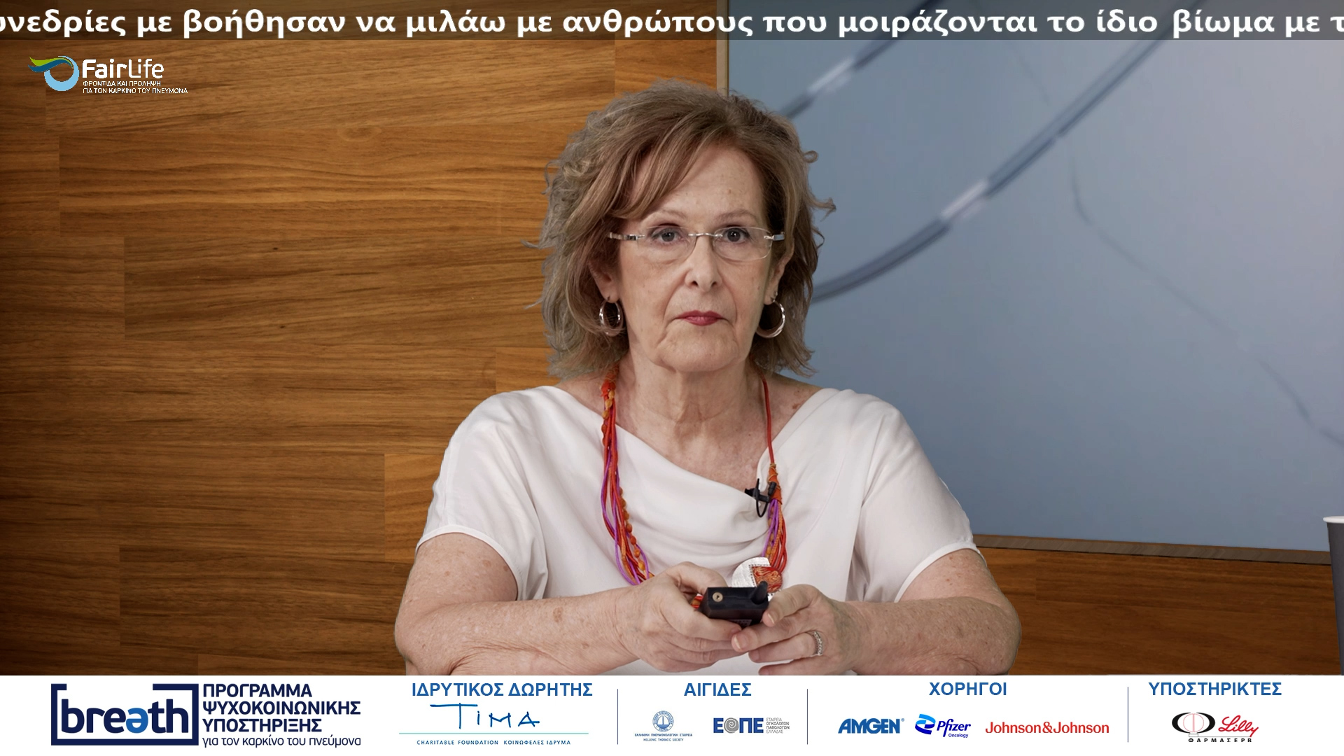 “Cancer does not only affect the body, it mainly affects the soul”, emphasized Ms. Varvara Laliotou, Lung Cancer Patient, who referred to the decisive contribution of the BREATH program in her own journey as a lung cancer patient. She spoke about the great gap that FairLife L.C.C. fills, a gap that should concern state services, and about the individual psychological support, which helped her express emotions without fear or guilt. Ms. Laliotou referred to the professionalism of the people of the BREATH Program and described her experience as valuable, speaking about the strength she found in small, but essential changes, such as seeing her life with meaning again, even in simple things,