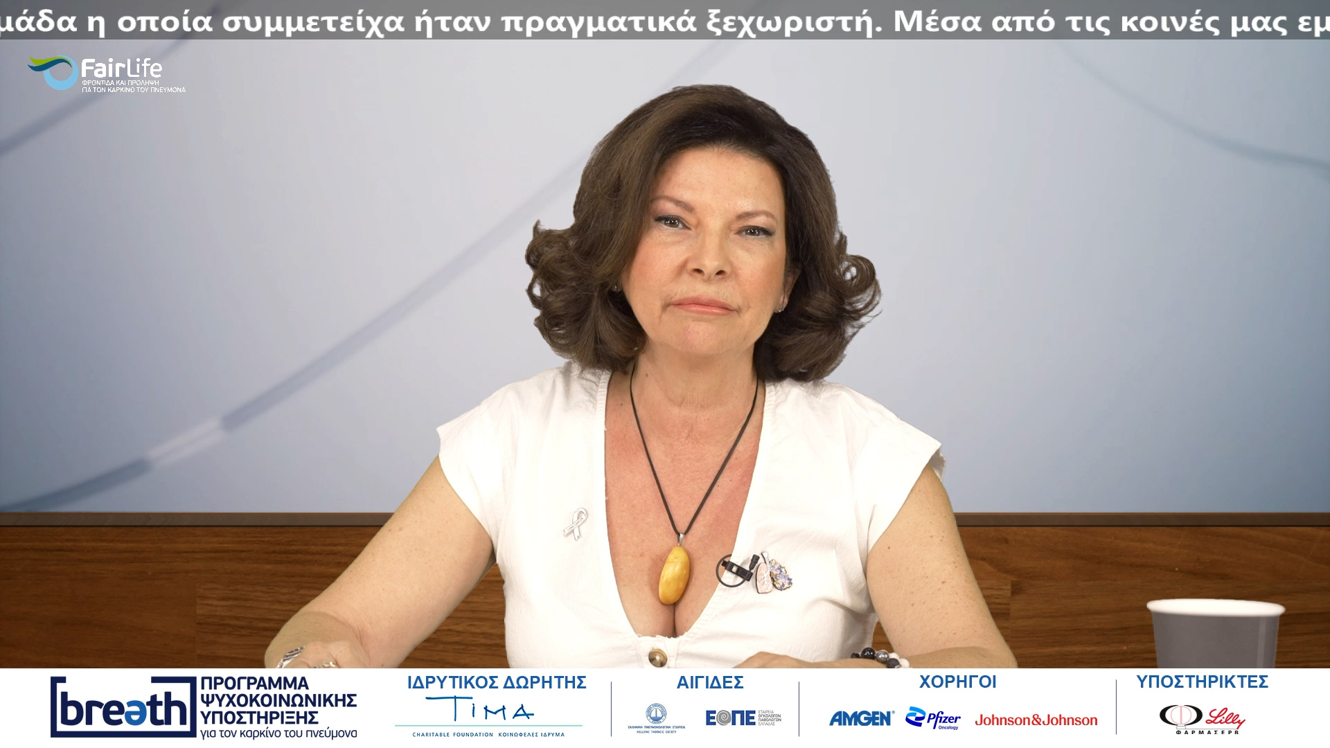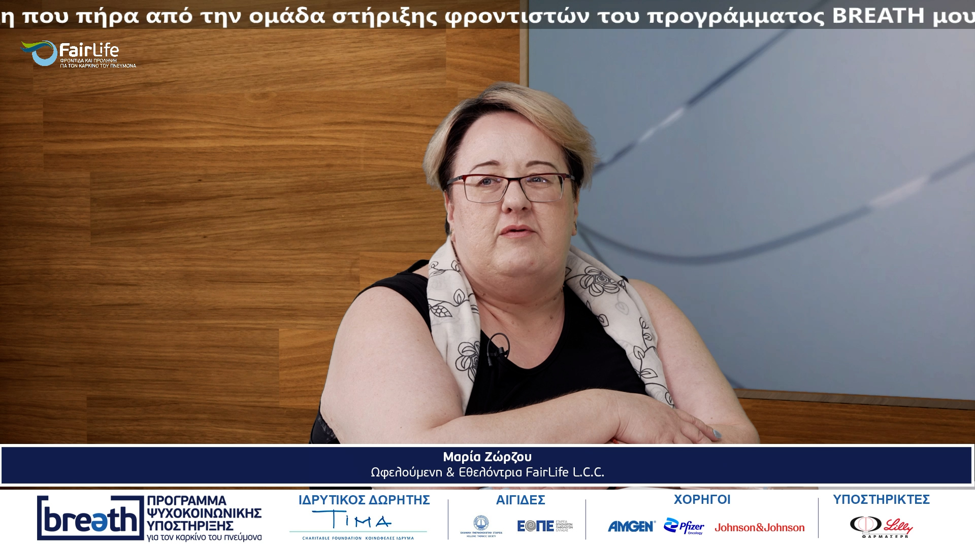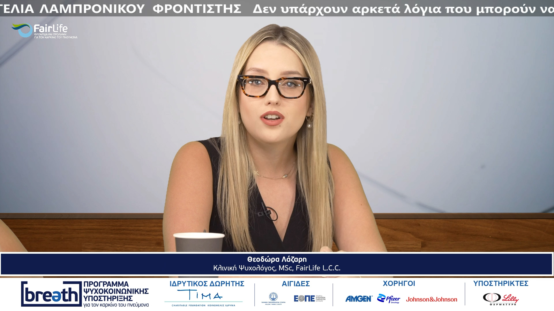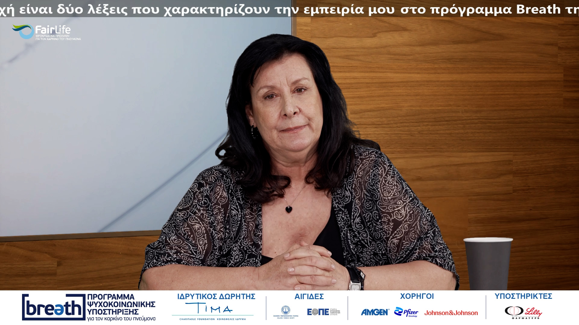 “Cancer does not only affect the body, it mainly affects the soul”, emphasized Ms. Varvara Laliotou, Lung Cancer Patient, who referred to the decisive contribution of the BREATH program in her own journey as a lung cancer patient. She spoke about the great gap that FairLife L.C.C. fills, a gap that should concern state services, and about the individual psychological support, which helped her express emotions without fear or guilt. Ms. Laliotou referred to the professionalism of the people of the BREATH Program and described her experience as valuable, speaking about the strength she found in small, but essential changes, such as seeing her life with meaning again, even in simple things,