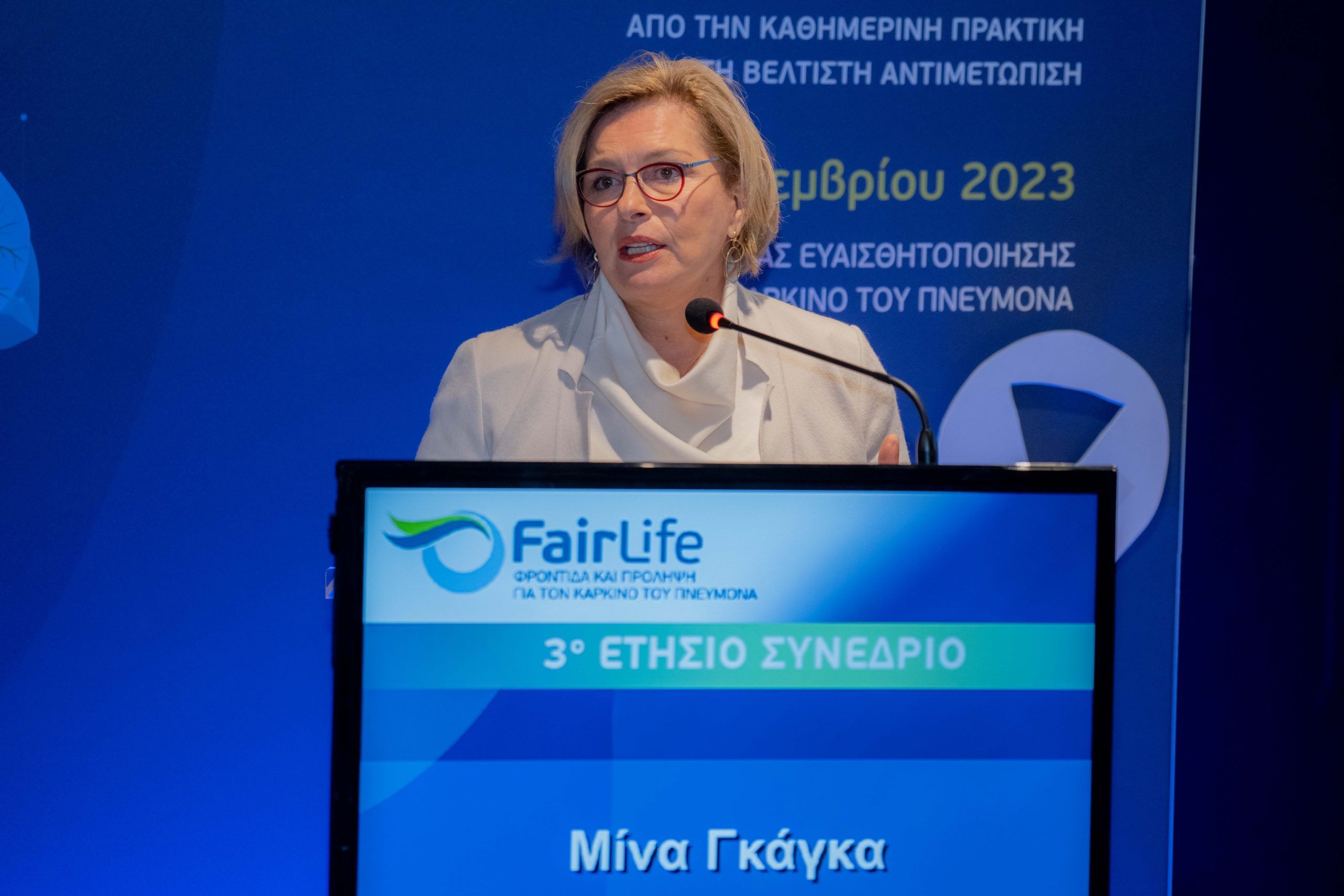Η κα. Mίνα Γκάγκα (MD, PhD, FERS, FCCP),Πνευμονολόγος, τ. Αναπληρώτρια Υπουργός Υγείας, Διευθύντρια της 1ης Πνευμονολογικής Κλινικής του Νοσοκομείου «Υγεία» και Μέλος του Standing Committee του Ευρωπαϊκού Γραφείου του Παγκόσμιου Οργανισμού Υγείας παρουσίασε συνοπτικά τα δεδομένα αναφορικά με τη νόσο στην χώρα μας. «Παρά την πρόοδο σε θεραπείες και τεχνολογία, ο καρκίνος του πνεύμονα παραμένει ο πιο θανατηφόρος τύπος καρκίνου, παγκοσμίως και στην χώρα μας, με διαστάσεις επιδημίας. Συγκεκριμένα, κάθε χρόνο καταγράφονται περίπου 1,8 εκ. νέες διαγνώσεις καρκίνου του πνεύμονα σε παγκόσμιο επίπεδο με σχεδόν ισόποσους θανάτους». Η κα Γκάγκα τόνισε τη σημαντικότητα της πρόληψης σε τρία επίπεδα: την αποφυγή παραγόντων κινδύνου όπως το κάπνισμα, το αλκοόλ, η ατμοσφαιρική ρύπανση, η παχυσαρκία (πρωτογενής), την πρώιμη διάγνωση (δευτερογενής) και την πρόληψη επανεμφάνισης της νόσου μέσα από συνεχή παρακολούθηση και εφαρμογή κατάλληλων θεραπευτικών σχημάτων (τριτογενής). Παράλληλα εξέφρασε την έντονη ανησυχία της για τη στροφή των νέων, ειδικότερα των εφήβων, προς την εκθετική χρήση εναλλακτικών μορφών καπνίσματος (θερμαινόμενο, άτμισμα, κτλ) και επισήμανε την ανάγκη εφαρμογής προγράμματος προληπτικού ελέγχου για τον καρκίνο του πνεύμονα με σαφείς ομάδες-στόχους, προδιαγραφές, συνεχή αξιολόγηση και εξειδικευμένες ειδικότητες. Η κα Γκάγκα τόνισε ότι η μείωση της θνησιμότητας από καρκίνο του πνεύμονα μέσω του προσυμπτωματικού ελέγχου με αξονική τομογραφία χαμηλής δόσης ακτινοβολίας (LDCT) σε άτομα υψηλού κινδύνου που έχουν ιστορικό καπνίσματος έχει τεκμηριωθεί με μετα-αναλύσεις και τυχαιοποιημένες ελεγχόμενες δοκιμές. Μάλιστα, ήδη από το 2013 η Ομάδα Εργασίας Υπηρεσιών Πρόληψης των Ηνωμένων Πολιτειών (USPSTF) συνέστησε τον προσυμπτωματικό έλεγχο για καρκίνο του πνεύμονα με LDCT σε ενήλικες ηλικίας 55-80 ετών, με ιστορικό καπνίσματος 20 πακέτων-ετών(1 πακέτο-έτος είναι ίσο με το κάπνισμα 20 τσιγάρων (1 πακέτο) ανά ημέρα για 1 έτος),οι οποίοι είναι ενεργοί καπνιστές ή έχουν διακόψει το κάπνισμα μέσα στα τελευταία 15 χρόνια. Την ανάγκη κάθε θεραπεία να είναι προσωποποιημένη για κάθε ασθενή, με βάση όχι μόνο το ιστολογικό και μοριακό προφίλ της νόσου αλλά και τα προβλήματα και τις προτιμήσεις του ασθενή και να αποτελείται από ιατρούς και επαγγελματίες υγείας διαφόρων ειδικοτήτων, συμπεριλαμβανομένων κοινωνικών λειτουργών, ψυχολόγων/ψυχο-ογκολόγων, που φροντίζουν τον ασθενή συνεχώς, από τη διάγνωση και σε κάθε βήμα της νόσου, επεσήμανε η κα Γκάγκα. Τέλος, αναφέρθηκε στη σημαντικότητα της υποστηρικτικής θεραπείας και της ψυχοκοινωνικής υποστήριξης που μπορεί να λάβει ένας ασθενής από την ιατρική του ομάδα και τους φροντιστές του, ενώ κατέληξε ότι το αισθητικό κομμάτι τόσο για άντρες όσο και για γυναίκες ασθενείς δεν θα πρέπει να έχει δευτερεύουσα σημασία καθώς επηρεάζει άμεσα την ψυχοσυναισθηματική τους κατάσταση.