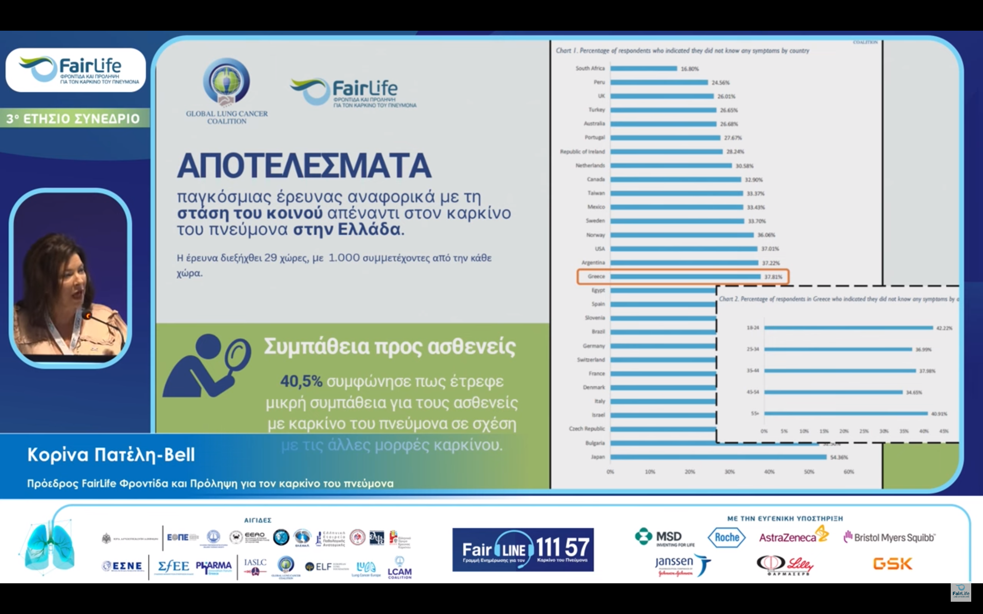 Η κα Θωμαΐς Σαρακινιώτη, Υπεύθυνη Προγραμμάτων, FairLife L.C.C., υπογράμμισε την ύπαρξη του στίγματος του καρκίνου του πνεύμονα και μίλησε για τον σχεδιασμό της καμπάνιας και το αξιοσημείωτο διαδικτυακό ενδιαφέρον που εκφράστηκε μέσα από τα νούμερα που καταγράφηκαν αναφορικά με τη δράση.