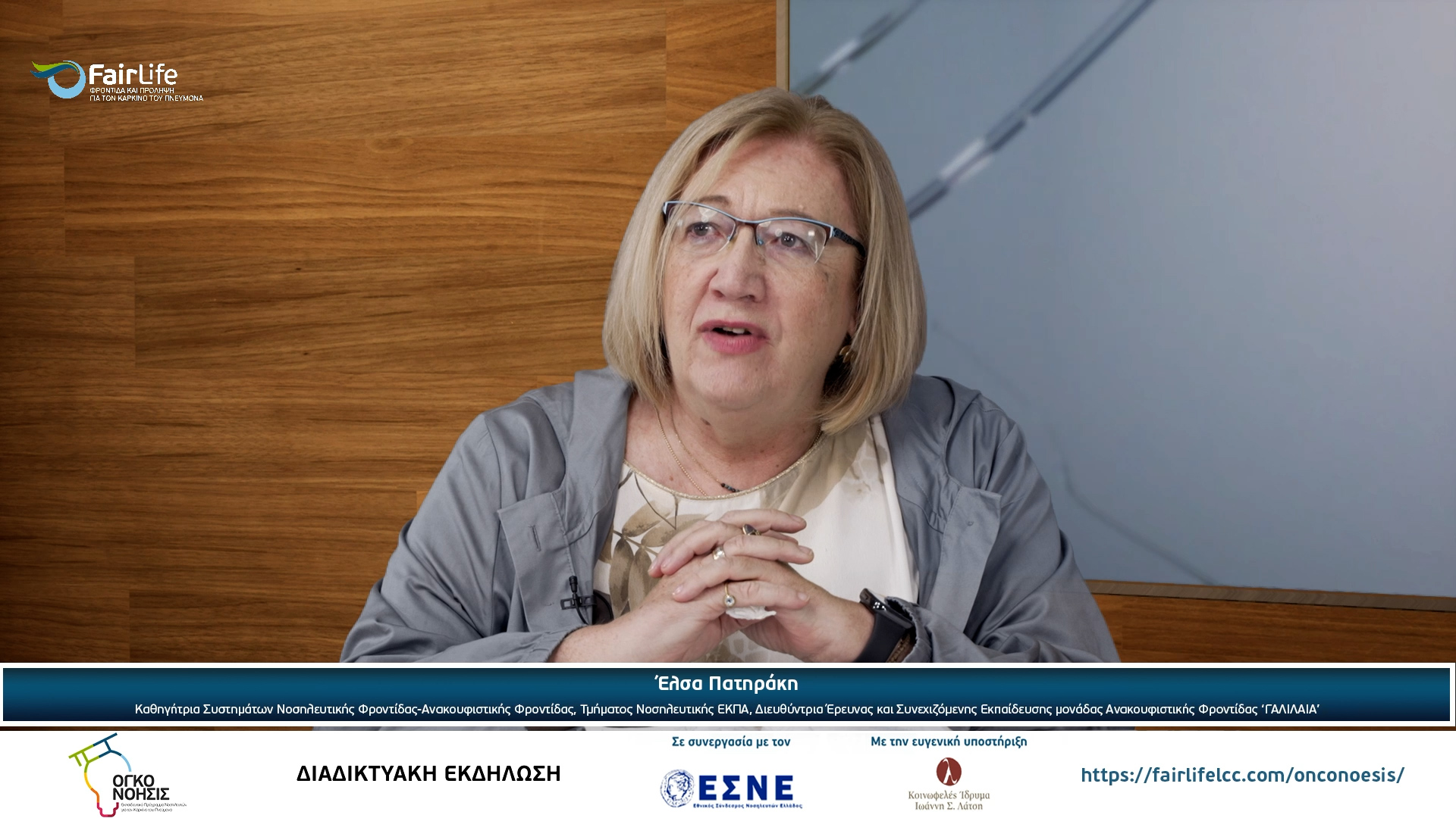Την εκδήλωση χαιρέτισαν η κα. Κορίνα Πατέλη – Bell, Πρόεδρος της FairLife Φροντίδα και Πρόληψη για τον καρκίνο του πνεύμονα και η κα. Ελένη Κυρίτση, Ομότιμη Καθηγήτρια ΠΑΔΑ, Πρόεδρος Εθνικού Συνδέσμου Νοσηλευτών Ελλάδος.