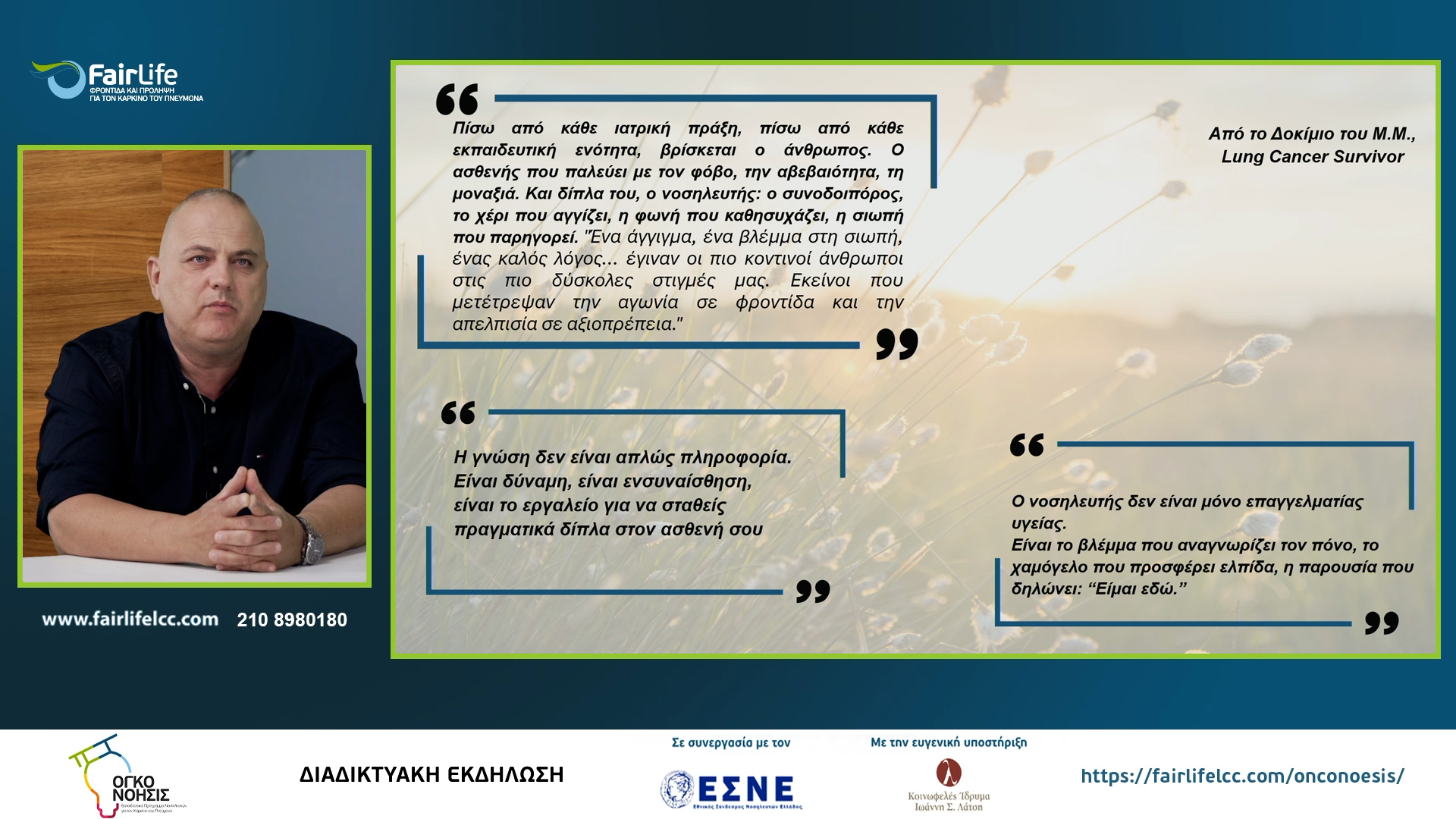 Στην εκδήλωση συμμετείχαν 10 διακεκριμένοι ομιλητές και σχολιαστές, οι οποίοι ανέλυσαν κρίσιμες πτυχές της φροντίδας και υποστήριξης στον καρκίνο του πνεύμονα, με έμφαση στον ρόλο των νοσηλευτών. Η συμμετοχή στο webinar ήταν δωρεάν και η εκδήλωση μεταδόθηκε ζωντανά μέσα από τα επίσημα κανάλια της FairLife L.C.C σε Facebook και YouTube.