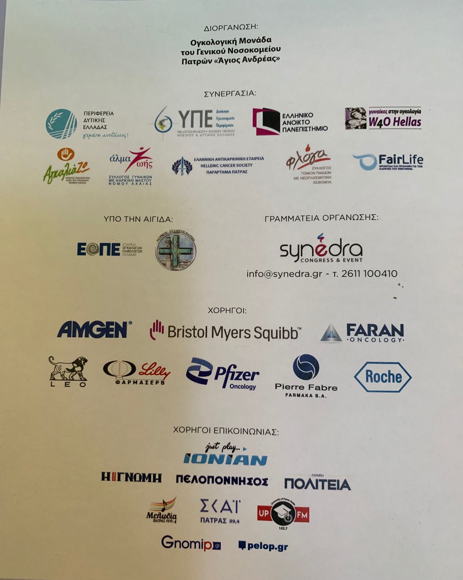 Η Διευθύντρια Παθολογικής Ογκολογίας και Υπεύθυνη της Ογκολογικής Μονάδας του Γενικού Νοσοκομείου Πατρών “Άγιος Ανδρέας”, κα. Αθηνά Χριστοπούλου, ήταν η πρόεδρος της διοργάνωσης, με συντονιστές τον Καθηγητή Χειρουργικής Ογκολογίας και Πρόεδρο του Ελληνικού Ανοικτού Πανεπιστημίου, κ.Οδυσσέα Τζώρα και την δημοσιογράφο του ΣΚΑΪ, κα Έλενα Παπαδημητρίου.