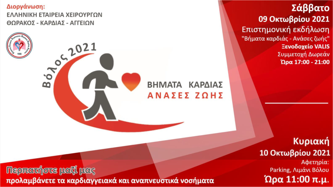 Η Ελληνική Εταιρεία Χειρουργών Θώρακος-Καρδιάς-Αγγείων (Ε.Ε.Χ.Θ.Κ.Α), σε συνεργασία με την Πνευμονολογική Κλινική του Πανεπιστημίου Θεσσαλίας και με την υποστήριξη του Ιατρικού Συλλόγου Μαγνησίας και της αστικής μη κερδοσκοπικής εταιρείας FairLife Lung Cancer Care, διοργανώνει στην όμορφη πόλη του Βόλου την ετήσια φθινοπωρινή της εκδήλωση με τίτλο «Βήματα καρδιάς, ανάσες ζωής».