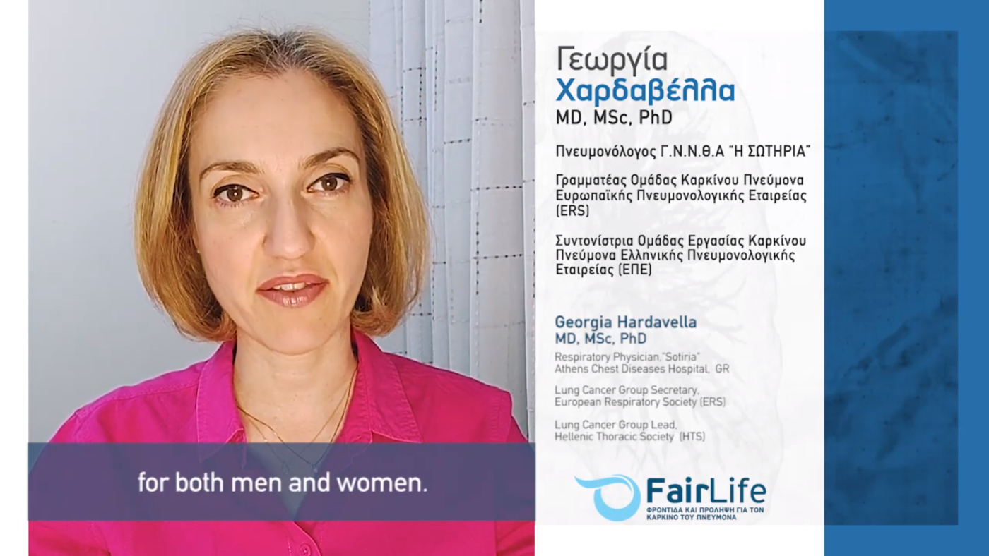 Αισιόδοξο μήνυμα για την πρόληψη του καρκίνου του πνεύμονα, τα σύγχρονα διαγνωστικά εργαλεία που είναι πλέον διαθέσιμα, αλλά και την αντιμετώπιση του ΚΠ, απευθύνει η Dr. Χαρδαβέλλα, πνευμονολόγος του Γ.Ν.Ν.Θ.Α «Η ΣΩΤΗΡΙΑ”, μέσω video που ευγενώς παραχώρησε στο «FairLife– Φροντίδα και Πρόληψη για τον καρκίνο του πνεύμονα», τον πρώτο μη κερδοσκοπικό κοινωνικό φορέα για τον καρκίνο του πνεύμονα που δημιουργήθηκε στην Ελλάδα στη μνήμη του Simon Βell, 57 ετών, που έχασε τη μάχη με τον καρκίνο του πνεύμονα τον Αύγουστο του 2020.