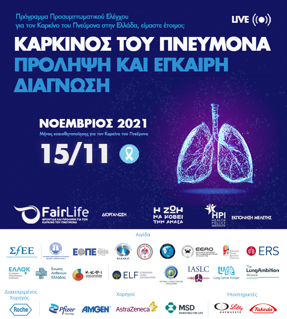 «Καρκίνος του Πνεύμονα – πρόληψη και έγκαιρη διάγνωση: Πρόγραμμα Προσυμπτωματικού Ελέγχου για τον Καρκίνο του Πνεύμονα στην Ελλάδα, είμαστε έτοιμοι;» είναι ο τίτλος της διαδικτυακής ημερίδας που διοργανώνει η FairLife LCC, τη Δευτέρα 15 Νοεμβρίου 2021. Την εκδήλωση συντονίζει και παρουσιάζει η κ. Ελενα Παπαδημητρίου, δημοσιογράφος.