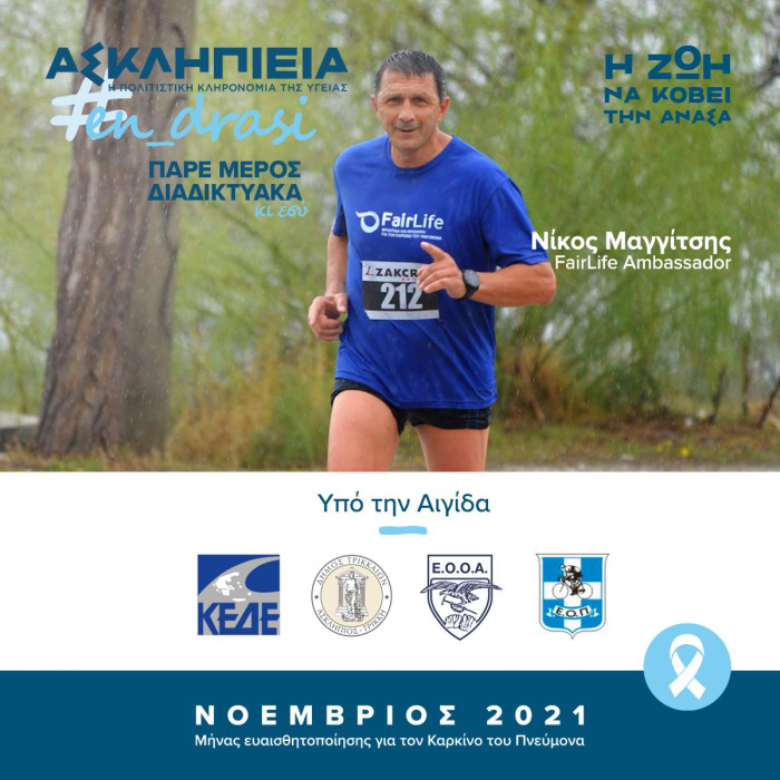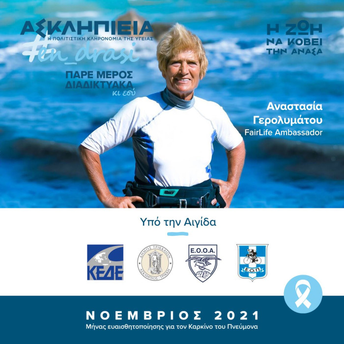 Στόχος, μέσα από δράσεις φυσικής άσκησης είναι να προωθηθεί το μήνυμα της ευζωίας, αλλά και μιας ολιστικής προσέγγισης της υγείας, την οποία ακολουθούσαν οι ιατροί της αρχαιότητας, ως όπλο για την πρόληψη και τη φροντίδα του καρκίνου του πνεύμονα. Στην προσπάθεια μας αυτή έχουμε συνοδοιπόρους και αρωγούς τους FairLife Ambassadors Αναστασία Γερολυμάτου, Κική Τσακαλδήμηκαι Νίκο Μαγγίτση.