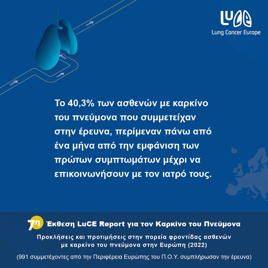 - Οι μεγάλοι χρόνοι αναμονής στην πορεία διάγνωσης του καρκίνου του πνεύμονα αποτελούν κορυφαία πρόκληση σε ολόκληρη την Ευρώπη. Ένας σημαντικός αριθμός συμμετεχόντων περίμενε περισσότερο από ένα μήνα από την εμφάνιση των πρώτων συμπτωμάτων μέχρι να επικοινωνήσει με τον ιατρό του (40%), μέχρι να κλείσει ραντεβού πρωτοβάθμιας περίθαλψης (20%), για να επισκεφθεί έναν πνευμονολόγο (27,3%) και να λάβει διάγνωση από την πρώτη επίσκεψη σε ειδικό ιατρό (28,2%).