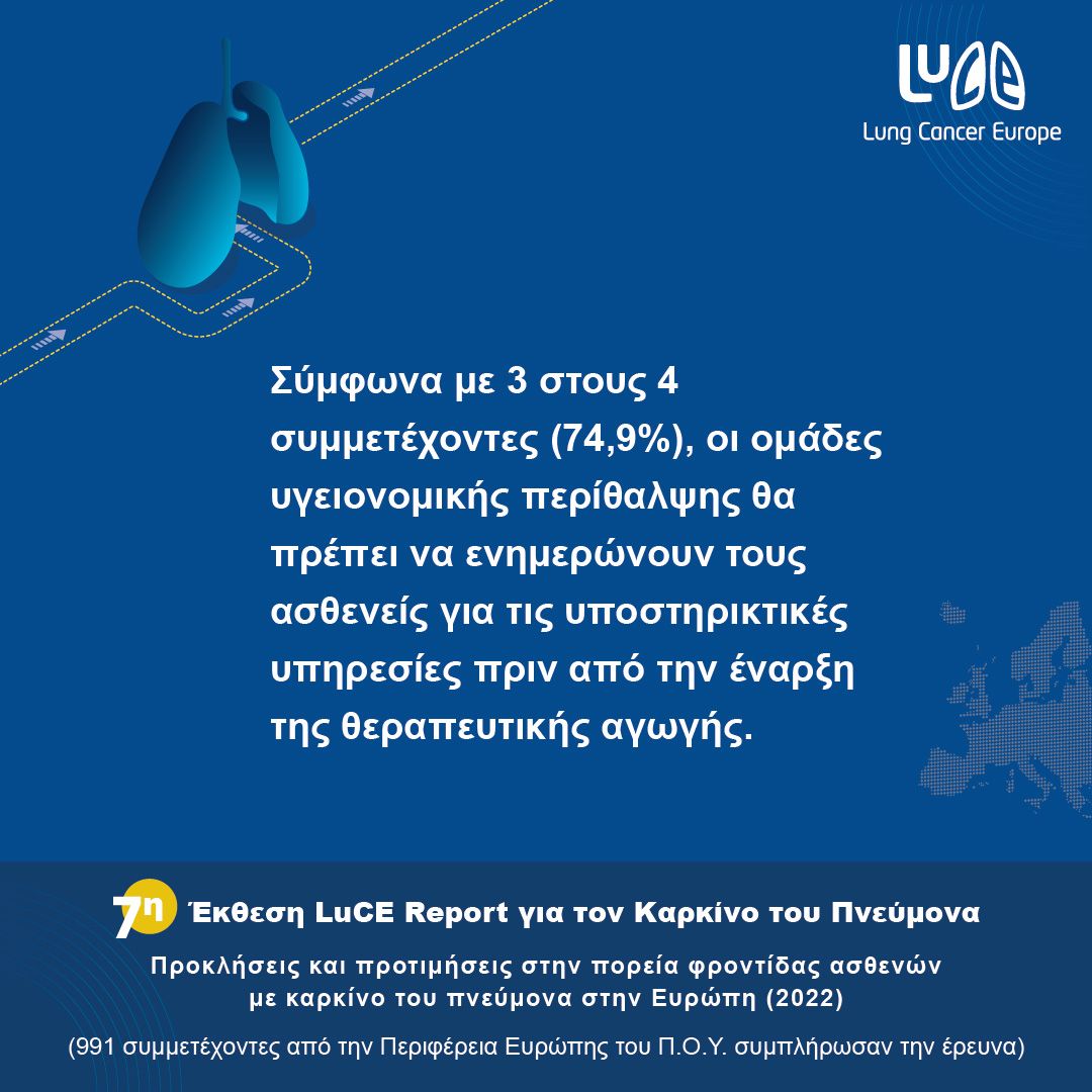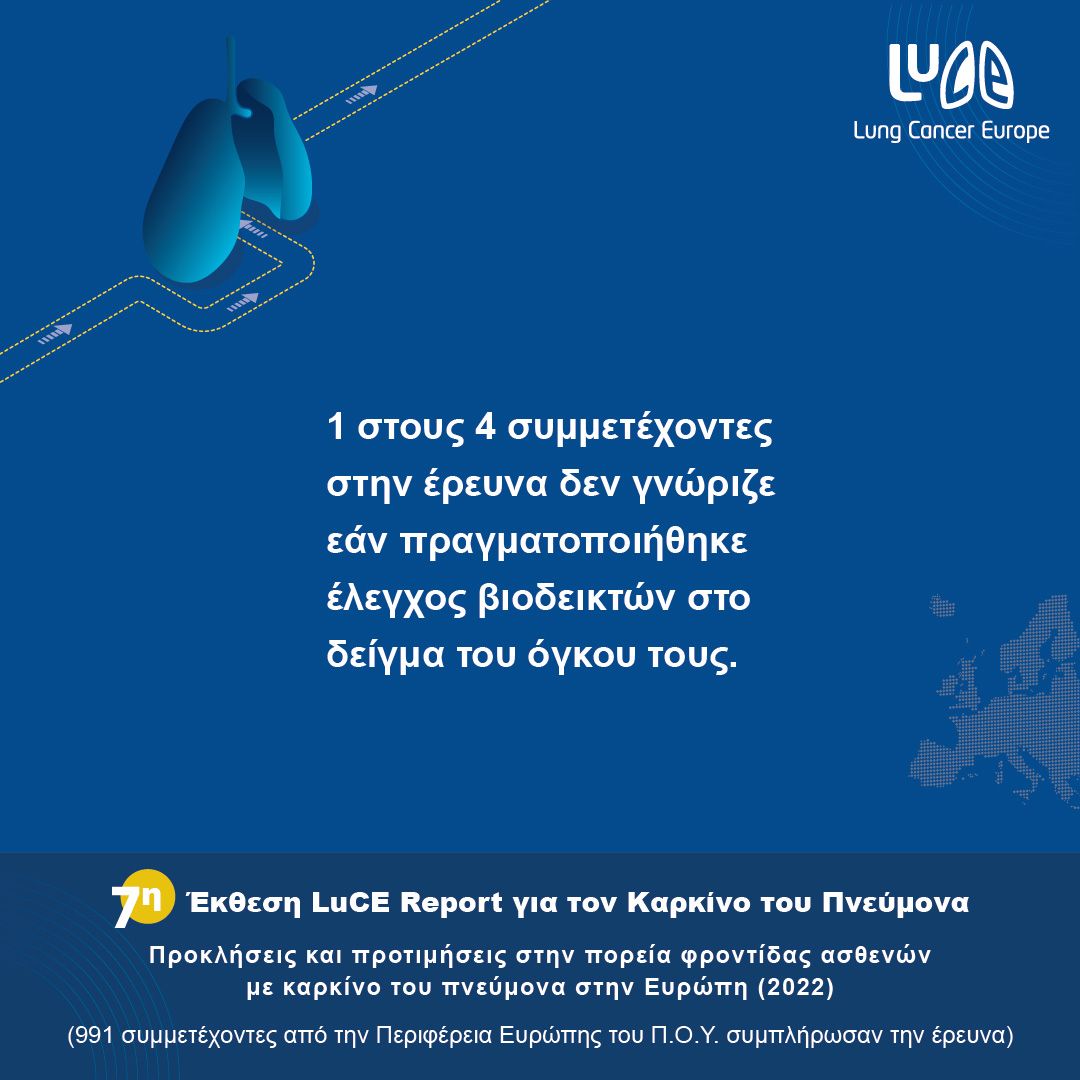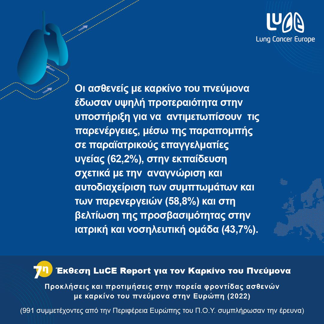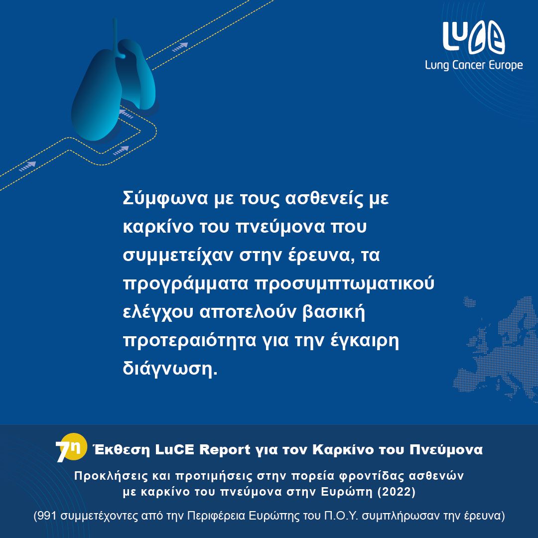 1 Δεκεμβρίου 2022. Ο Ευρωπαϊκός Οργανισμός για τον Καρκίνο του Πνεύμονα (LuCE) εξέδωσε την 7η έκδοση της Έκθεσης LuCE Report. Πρόκειται για μια ετήσια πρωτοβουλία,της οποίας ηγούνται οργανώσεις ασθενών με καρκίνο του πνεύμονα, σε ολόκληρη την Ευρώπη, με σκοπό την ευαισθητοποίηση σχετικά με τις κύριες προκλήσεις που αντιμετωπίζουν τα άτομα που πλήττονται από αυτήν τη νόσο.