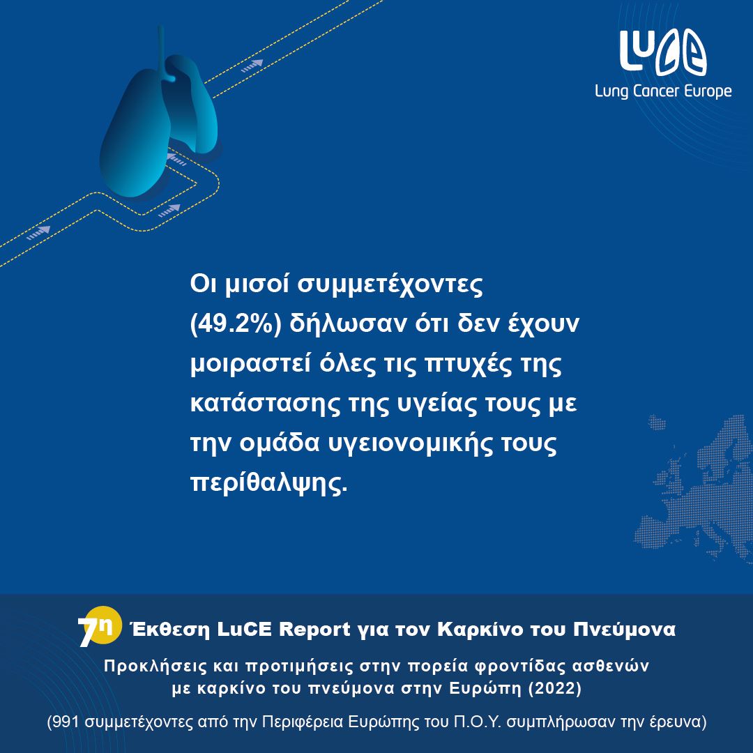 - Η επικοινωνία μεταξύ των ατόμων με καρκίνο του πνεύμονα και των επαγγελματιών υγείας είναι ζωτικής σημασίας για την ποιοτική υποστηρικτική φροντίδα κατά την πορεία της νόσου. Ωστόσο, οι μισοί συμμετέχοντες (49,2%) δεν έχουν μοιραστεί όλες τις πτυχές της κατάστασης της υγείας τους με την ομάδα υγειονομικής τους περίθαλψης. Προτάθηκαν τα ακόλουθα μέτρα για τη βελτίωση της διαδικασίας επικοινωνίας:πρόσβαση σε παραϊατρικούς επαγγελματίες υγείας, ειδικούς στον καρκίνο (44%), μεγαλύτερη διάρκεια ιατρικών επισκέψεων (44%) και ύπαρξη κεντρικού σημείου επαφής (44%).