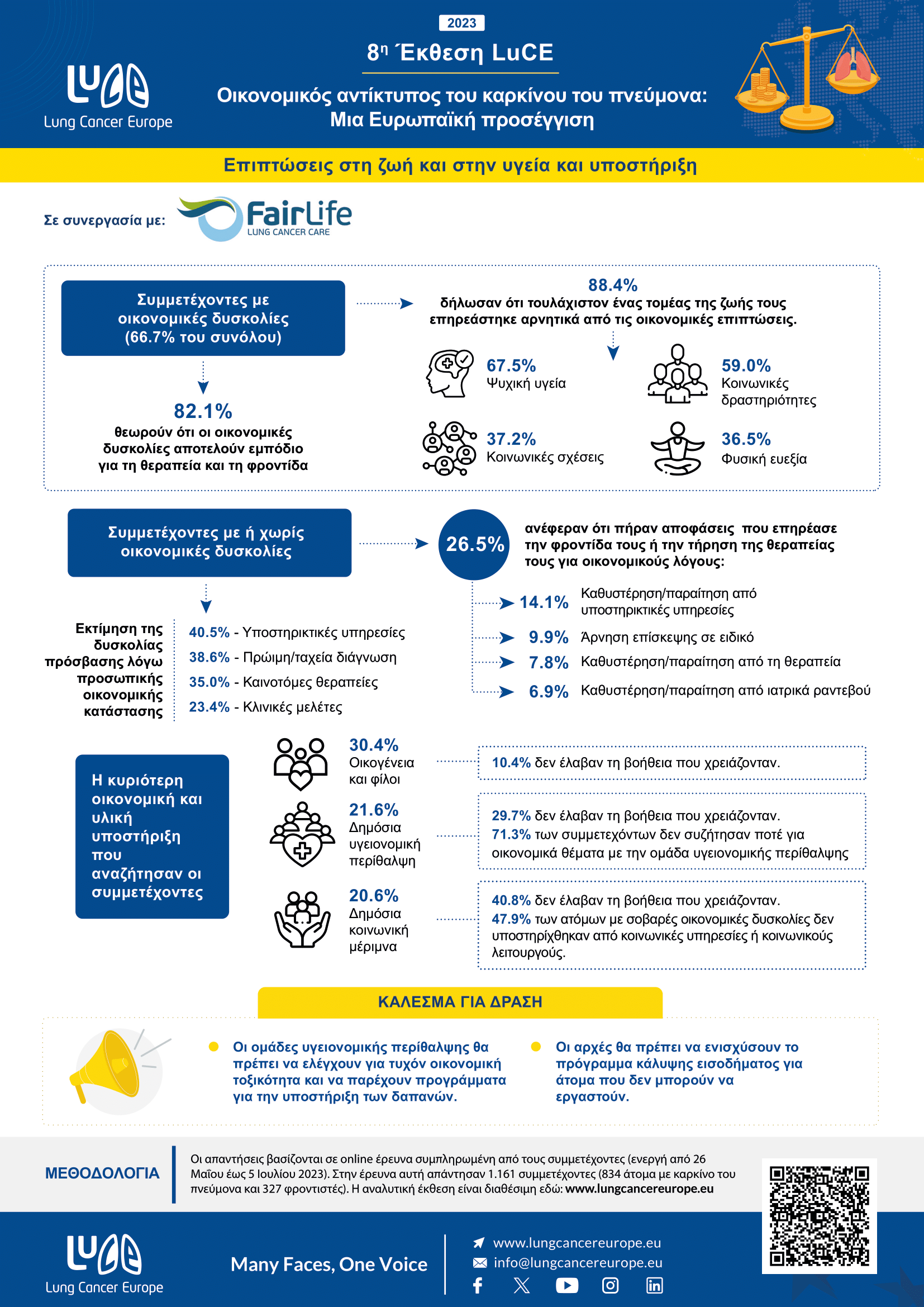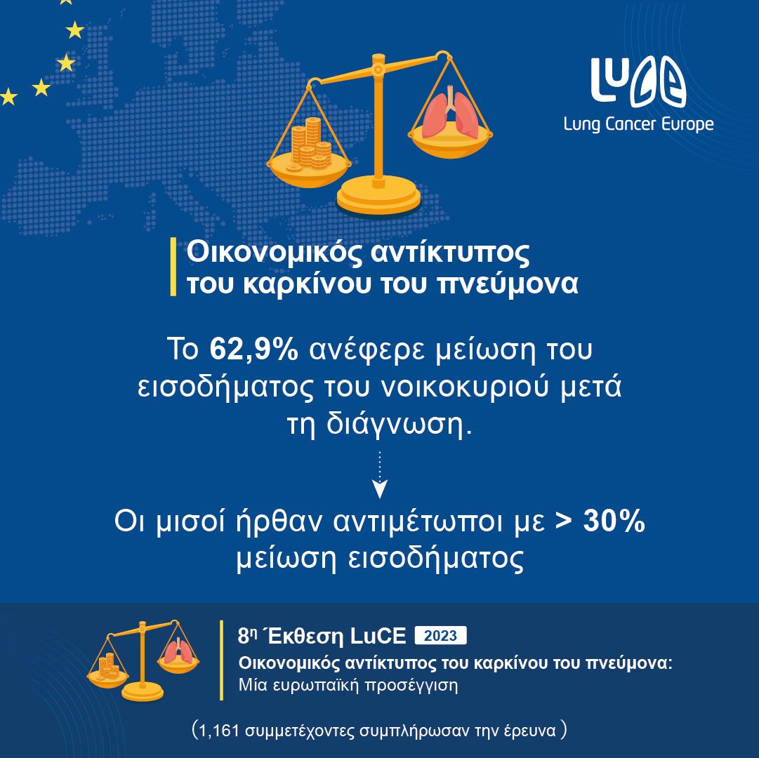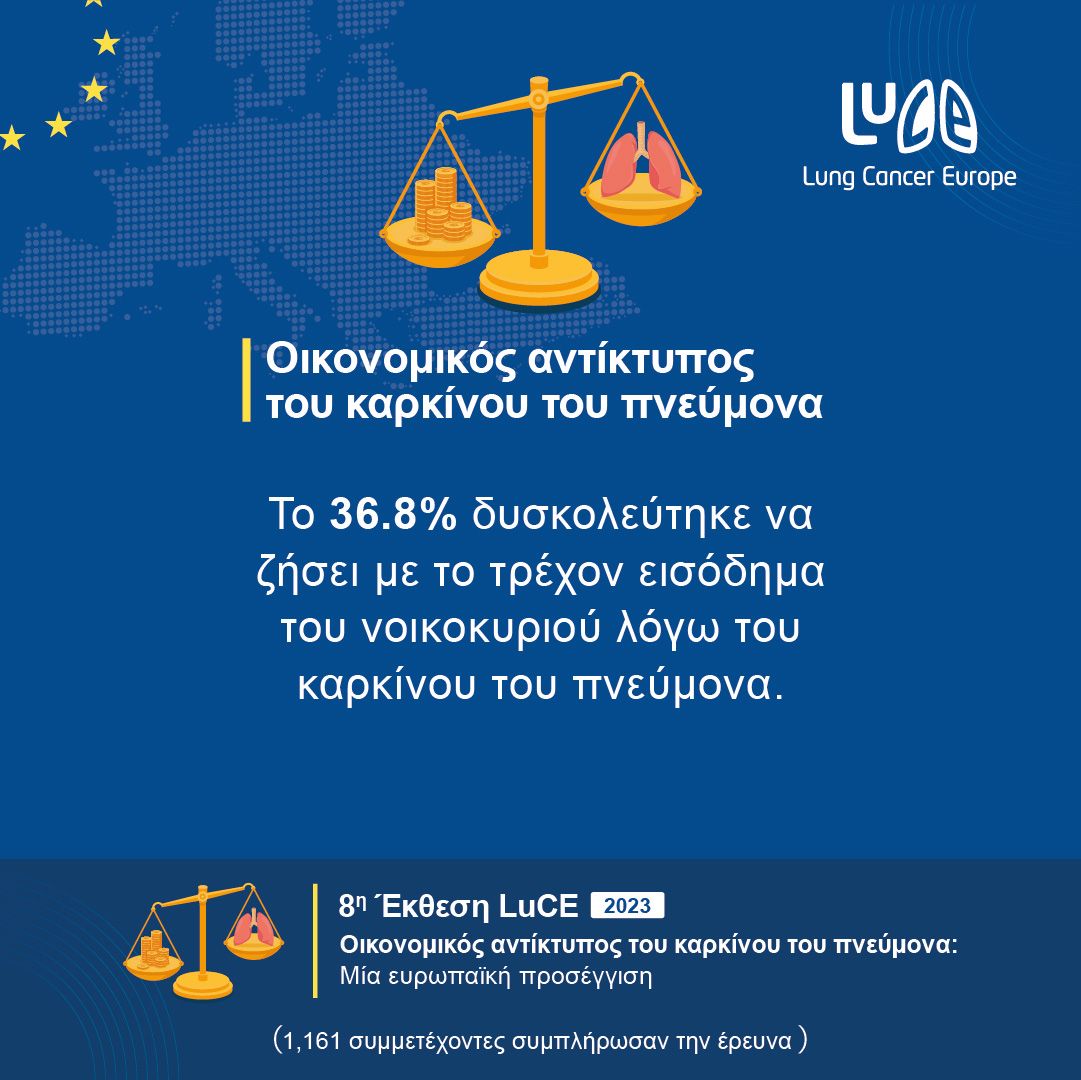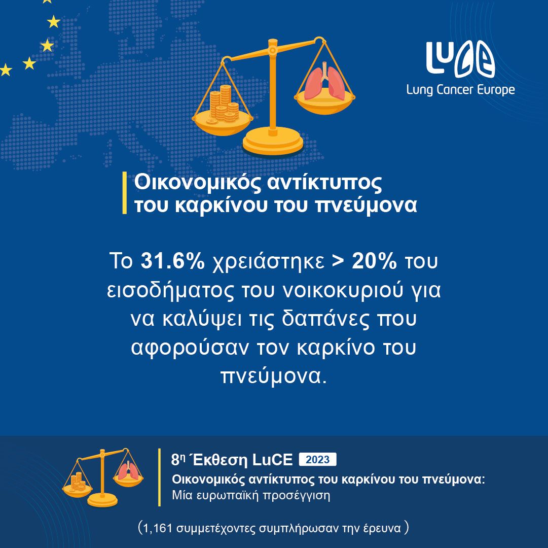 Η 8η έκθεση LuCE διερευνά την οικονομική επιβάρυνση από τον καρκίνο του πνεύμονα, όπως καταγράφεται από τα άτομα που έχουν διαγνωστεί με καρκίνο του πνεύμονα και από τους φροντιστές τους. Η συλλογή δεδομένων έγινε μέσω μιας online έρευνας που συμπληρώθηκε(26 Μαΐου -5 Ιουλίου 2023) από 1.161 συμμετέχοντες (834 άτομα με καρκίνο του πνεύμονα και 327 φροντιστές) στην Ευρωπαϊκή Περιφέρεια του ΠΟΥ. Η έρευνα μας υποδηλώνει ότι παρόλο που η οικονομική τοξικότητα συναντάται συχνά στα άτομα που βιώνουν τον καρκίνο του πνεύμονα, μόνο μια μειοψηφία των συμμετεχόντων δήλωσε ότι υπάρχουν οφέλη για τα άτομα με καρκίνο και τους φροντιστές στη χώρα τους.