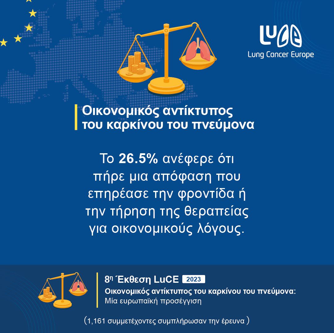 - Τα ευρήματα μας δείχνουν πως το 26,5% των ανθρώπων που βιώνουν τον καρκίνο του πνεύμονα πήρε μια απόφαση που επηρέασε την φροντίδα τους ή την τήρηση της θεραπείας τους για οικονομικούς λόγους.