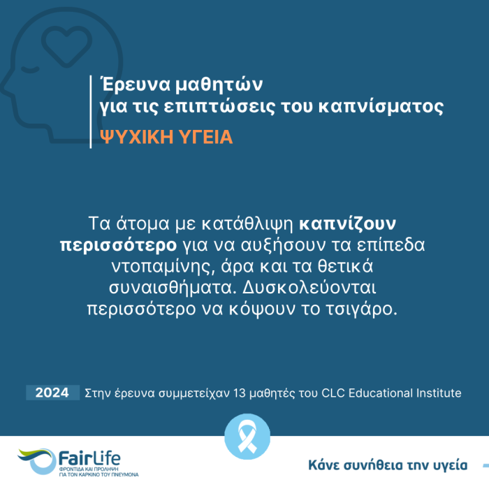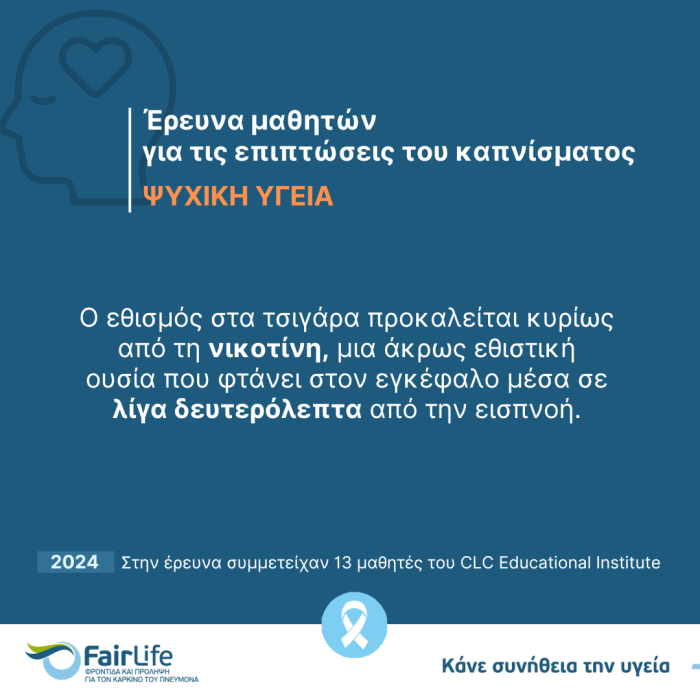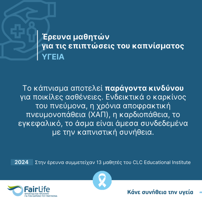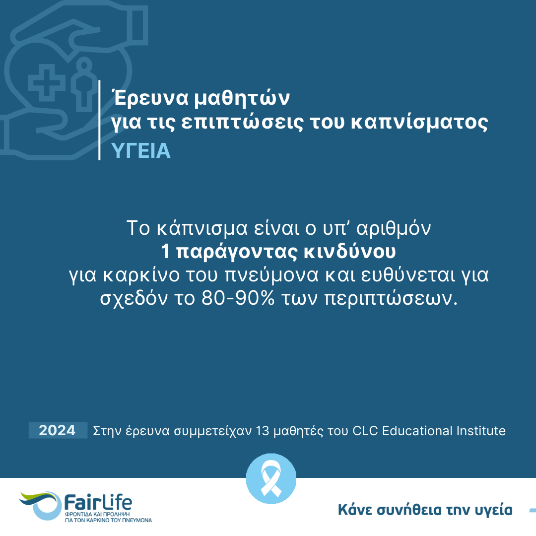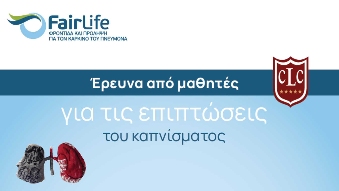 H ευαισθητοποίηση των νέων για το κάπνισμα και τις επιπτώσεις του, μέσα από την αναφορά στους τέσσερις βασικούς τομείς, Υγεία, Ψυχική Υγεία, Οικονομία και Περιβάλλον ήταν ο στόχος της έρευνας που πραγματοποίησαν 13 μαθητές του CLC Educational Institute, με τη συνεργασία της FairLife Φροντίδα και Πρόληψη για τον καρκίνο του πνεύμονα και παρουσιάζεται στο πλαίσιο της Παγκόσμιας Ημέρα κατά του Καρκίνου, στις 4 Φεβρουάριου «Close the Care Gap».