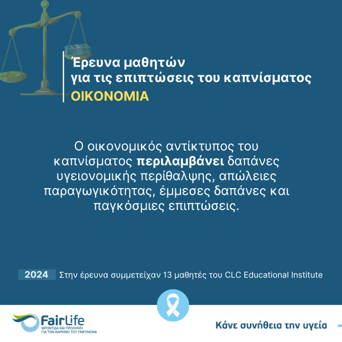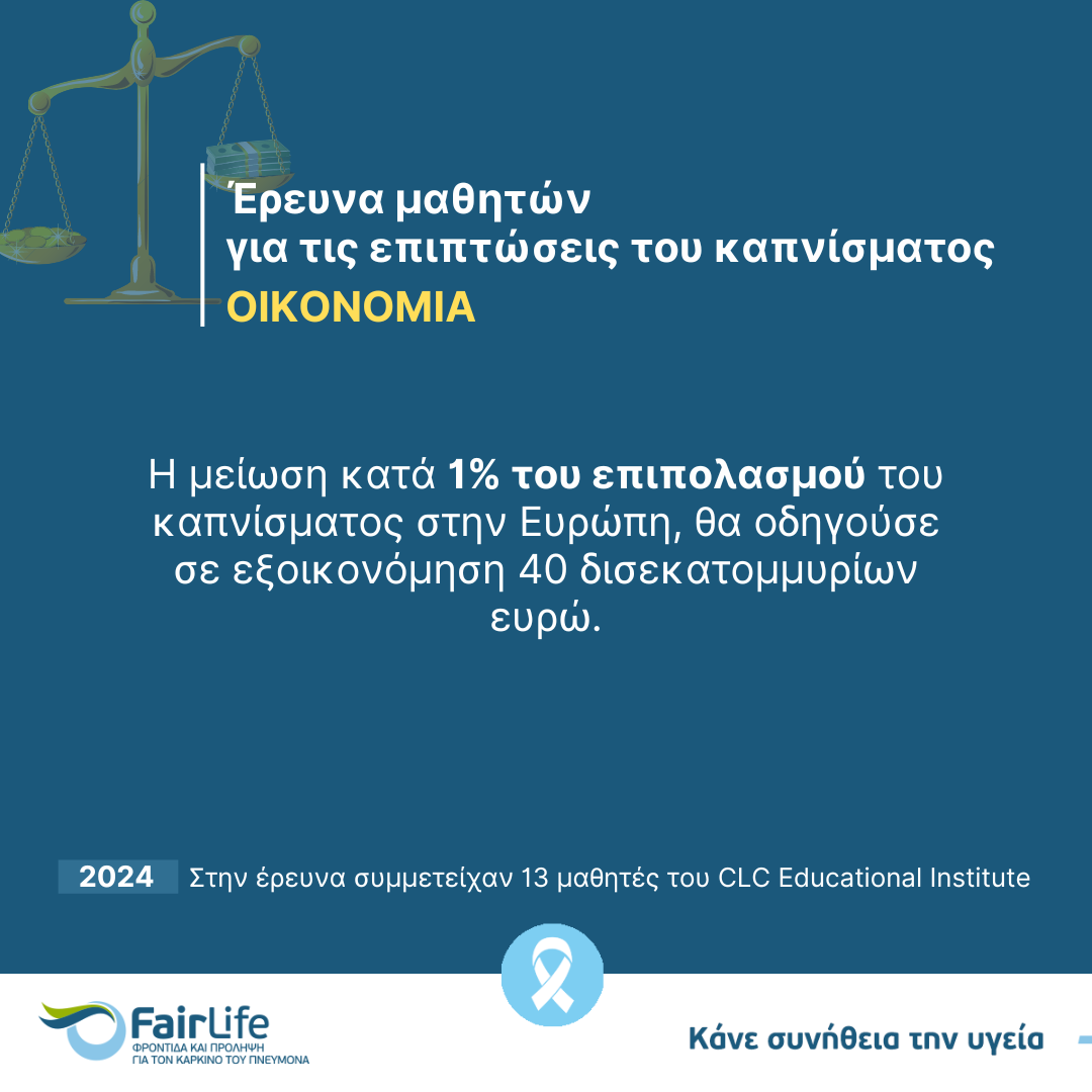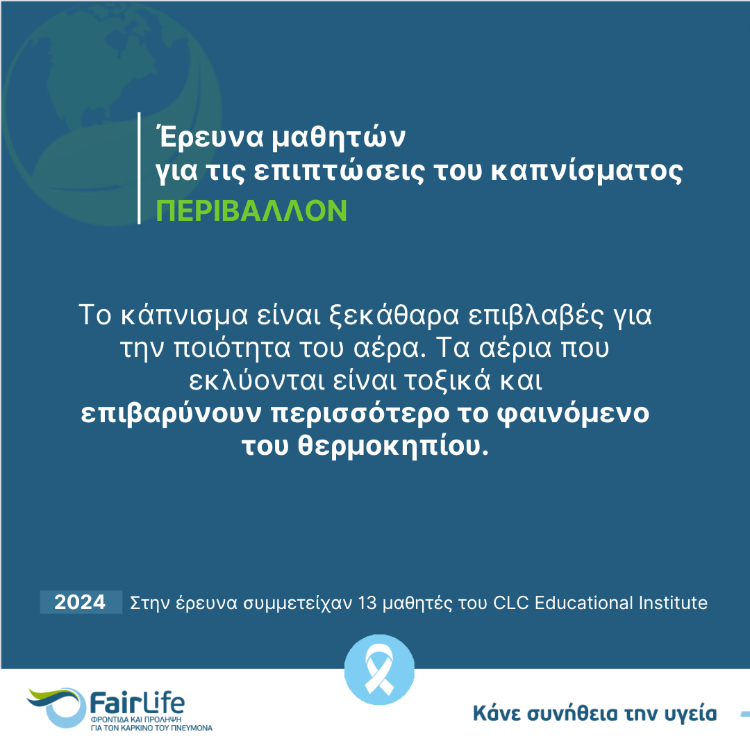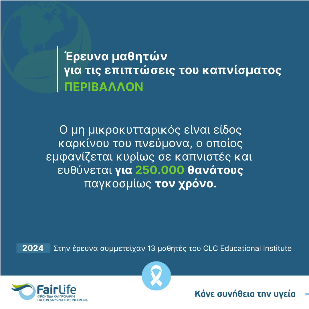 Στο πλαίσιο της Παγκόσμιας Ημέρας κατά του Καρκίνου στις 4 Φεβρουαρίου 2024, το CLC Educational Institute με τη συνεργασία της FairLife L.C.C. παρουσιάζουν την έρευνα των μαθητών σχετικά με τις συνέπειες του καπνίσματος στην υγεία, το περιβάλλον και την οικονομία.