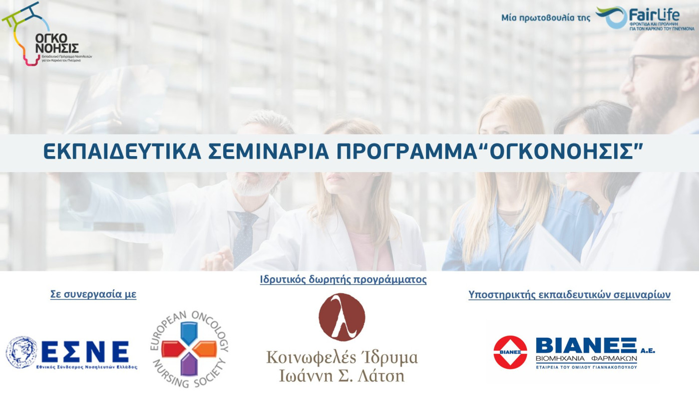 Η FairLife Φροντίδα και Πρόληψη για τον καρκίνο του πνεύμονα, με την επιστημονική υποστήριξη του Τομέα Νοσηλευτικής Ογκολογίας του Εθνικού Συνδέσμου Νοσηλευτών Ελλάδος (ΕΣΝΕ), ξεκινά την Παρασκευή 12 Σεπτεμβρίου το καινοτόμο εκπαιδευτικό πρόγραμμα «ΟγκοΝόησις», διάρκειας 36 ωρών, με τη συμμετοχή 36 εισηγητών από όλη την Ελλάδα.
